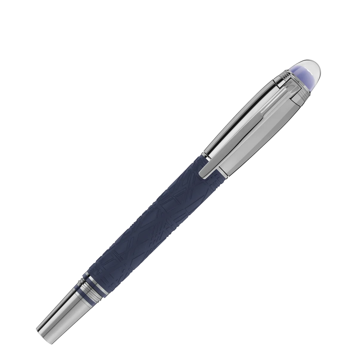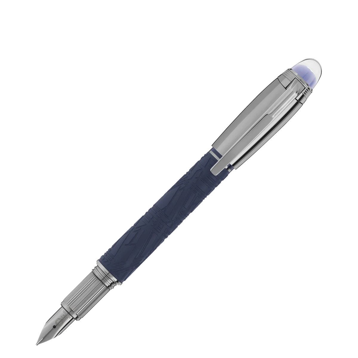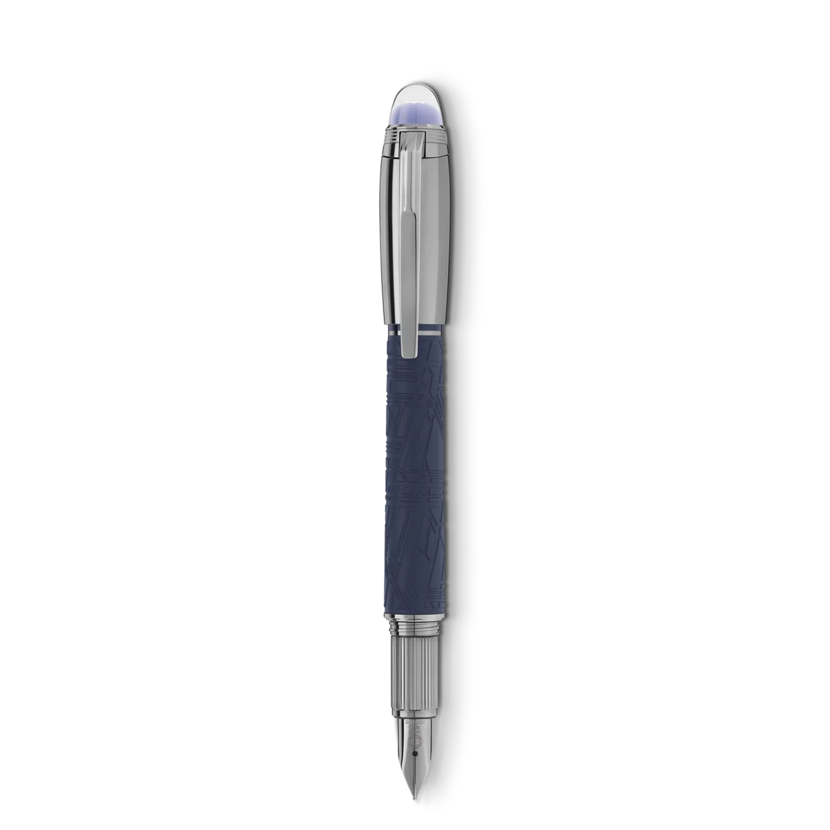 StarWalker SpaceBlue mira más allá del planeta Tierra y se dirige hacia las estrellas y la galaxia. Esta nueva colección StarWalker aporta un nuevo aspecto al cuerpo de resina, con un diseño que recuerda las intrincadas estructuras del patrón de Widmanstätten, una de las creaciones más hipnóticas de la naturaleza. El capuchón y los accesorios metálicos están recubiertos de rutenio oscuro, acompañado de un tono azul espacio profundo para la resina preciosa mate, que recuerda los matices de un cielo estrellado. Además, el subdomo de la parte superior del capuchón, sobre el que flota el emblema de Montblanc, es de color azul espacio profundo. La pluma estilográfica está fabricada a mano con un plumín de oro Au585 recubierto de rutenio.