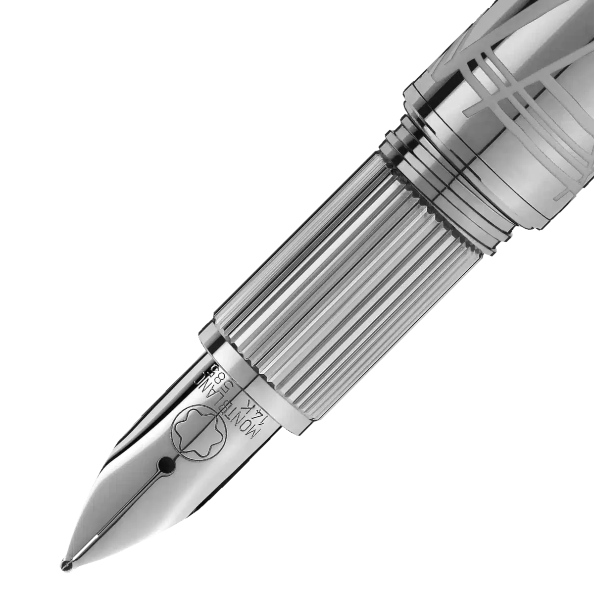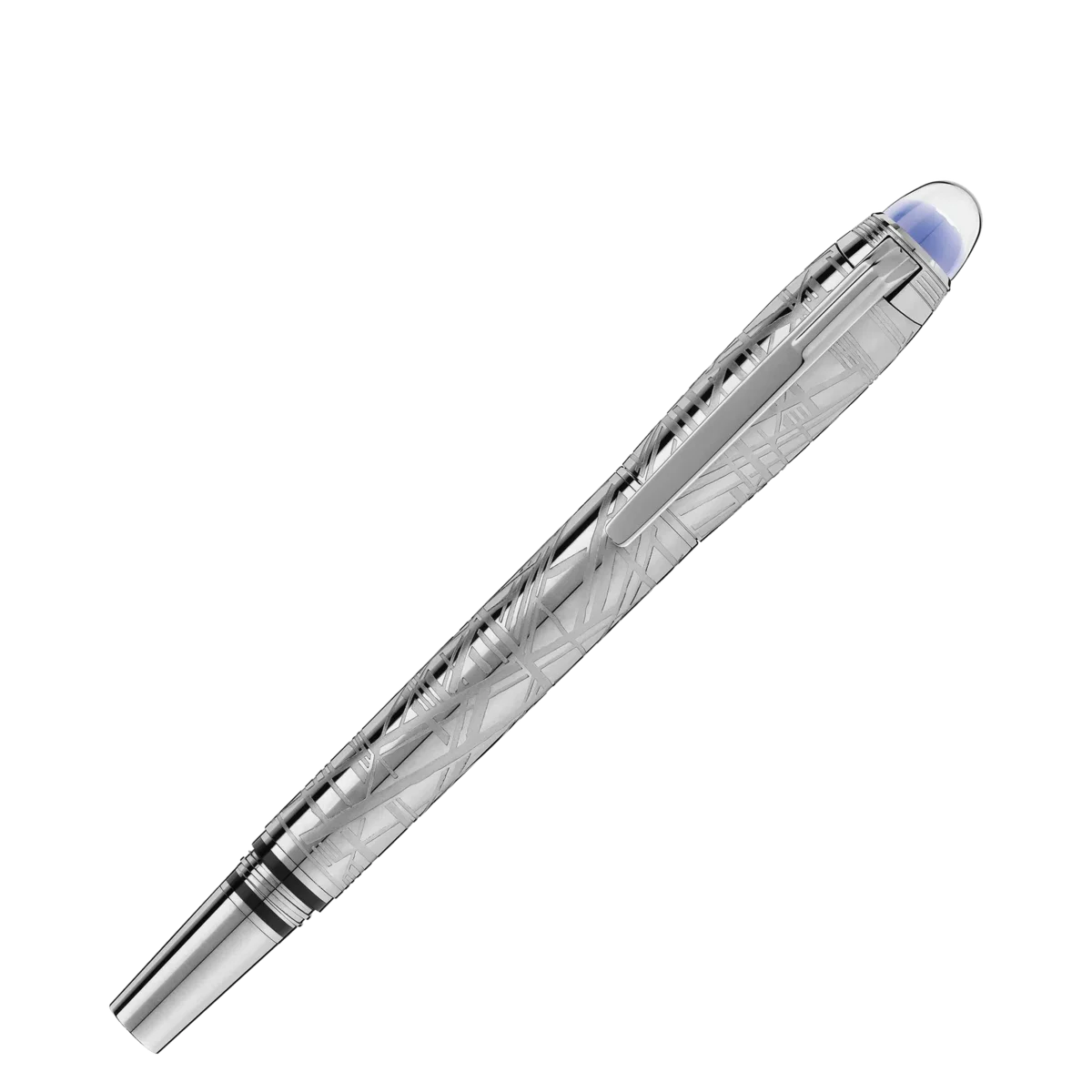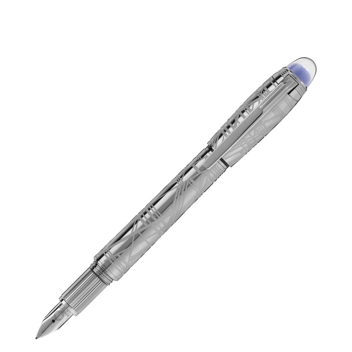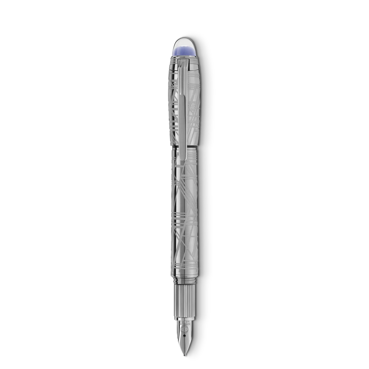 StarWalker SpaceBlue mira más allá del planeta Tierra y se dirige hacia las estrellas y la galaxia. Esta nueva colección StarWalker aporta un nuevo aspecto al capuchón y al cuerpo metálicos, con un diseño que recuerda las intrincadas estructuras del patrón de Widmanstätten, una de las creaciones más hipnóticas de la naturaleza. Todas las piezas metálicas están recubiertas de rutenio oscuro, acompañado de un subdomo azul oscuro en la parte superior del capuchón, que recuerda los tonos de un cielo estrellado, sobre el que flota el emblema de Montblanc. La pluma estilográfica está fabricada a mano con un plumín de oro Au 585 recubierto de rutenio.