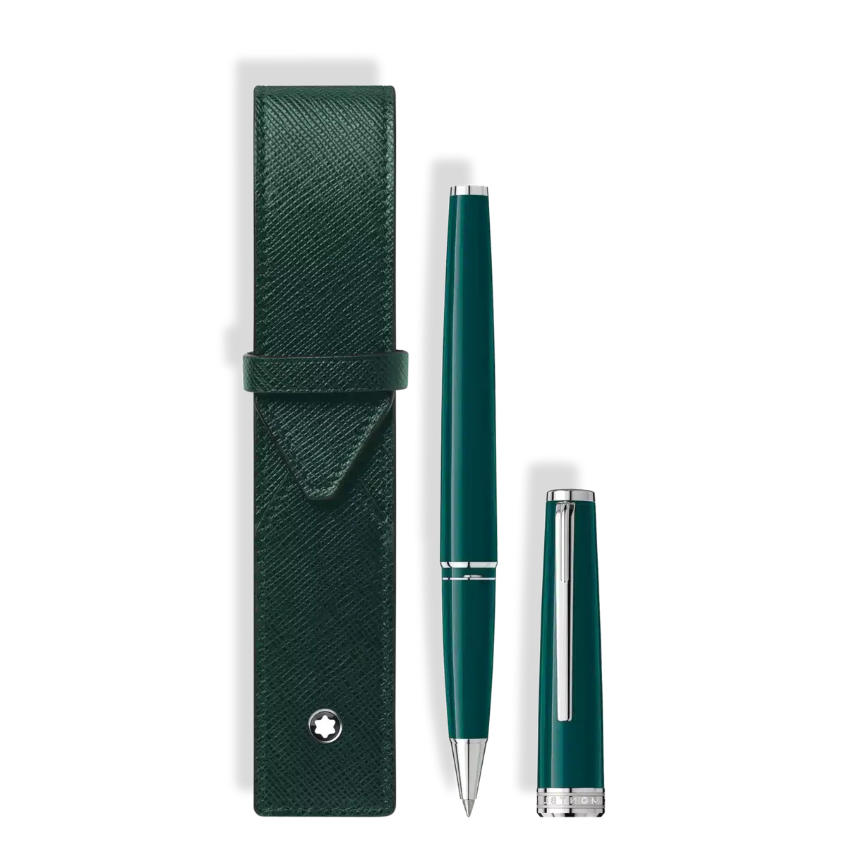 El set incluye un bolígrafo roller PIX Deep Green y un estuche para bolígrafos Sartorial Deep Green. El bolígrafo roller está fabricado en resina preciosa y cuenta con accesorios recubiertos de platino. La parte superior del capuchón está coronada con el emblema blanco de Montblanc. Mantenga su instrumento de escritura seguro y elegante en este estuche para bolígrafos específico. La piel plena flor añade un atractivo táctil, mientras que la silueta superpuesta recuerda la forma de un sobre, en un nuevo homenaje a la palabra escrita.
