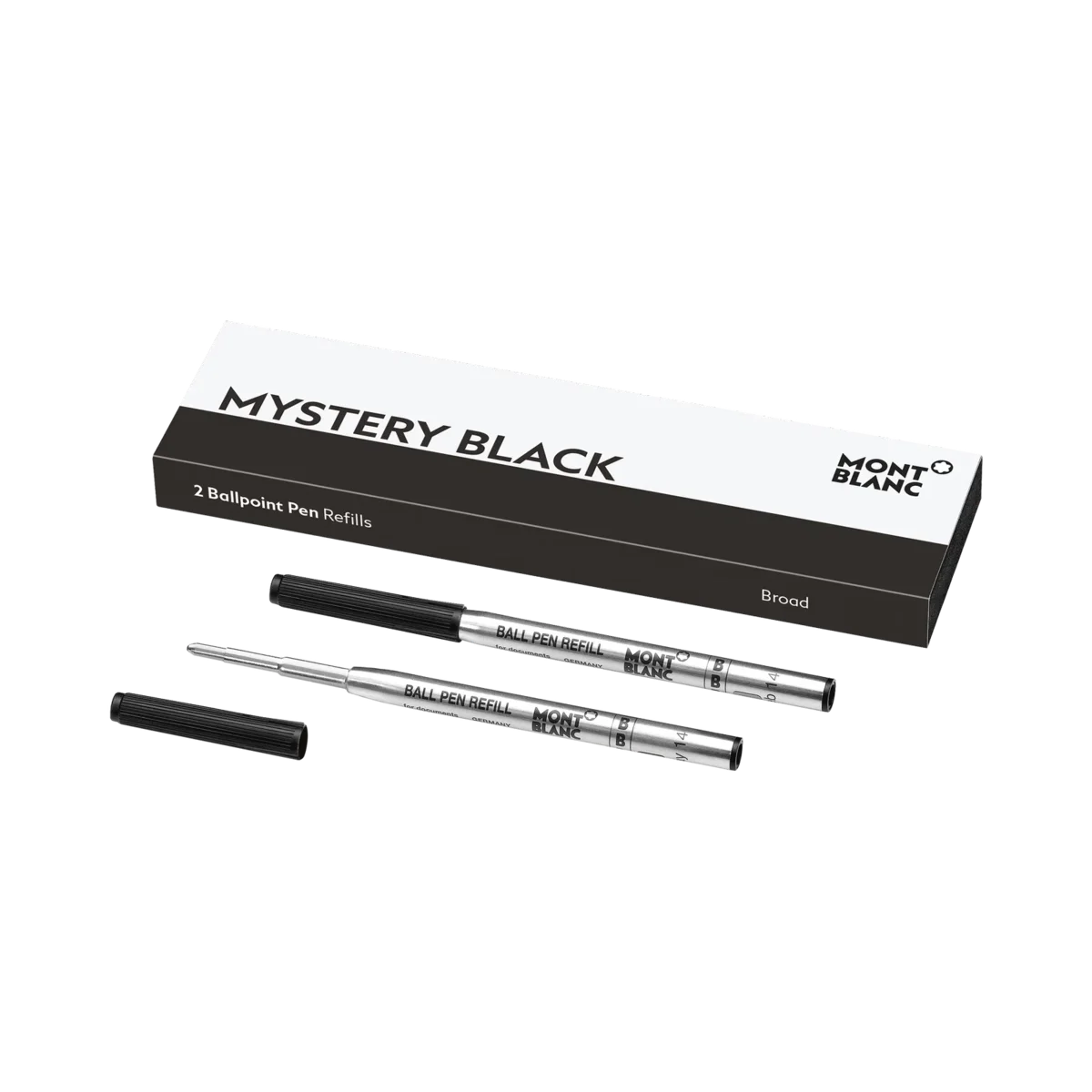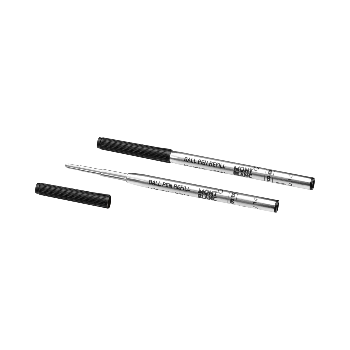 Adecuadas para todos los bolígrafos Montblanc, excepto Meisterstück Homage to W.A. Mozart. Los colores de los bolígrafos Montblanc «Negro misterioso», «Azul real», «Rojo Modena» y «Verde irlandés» son a prueba de documentos y han sido probados según la norma DIN ISO 12757-2.Unidades de embalaje = 2 recambios B = ancho