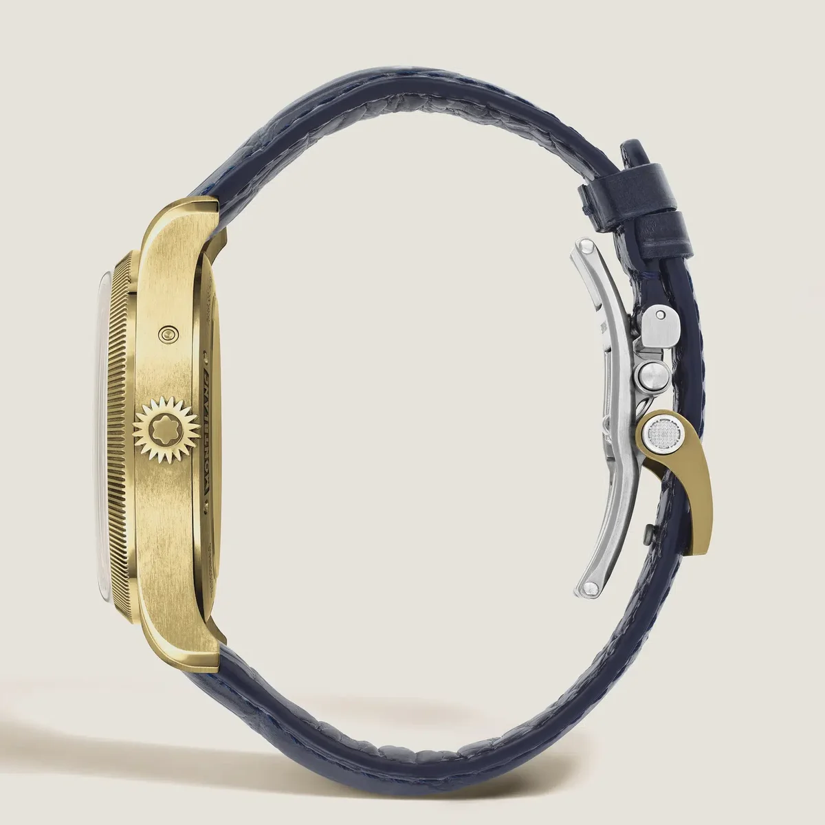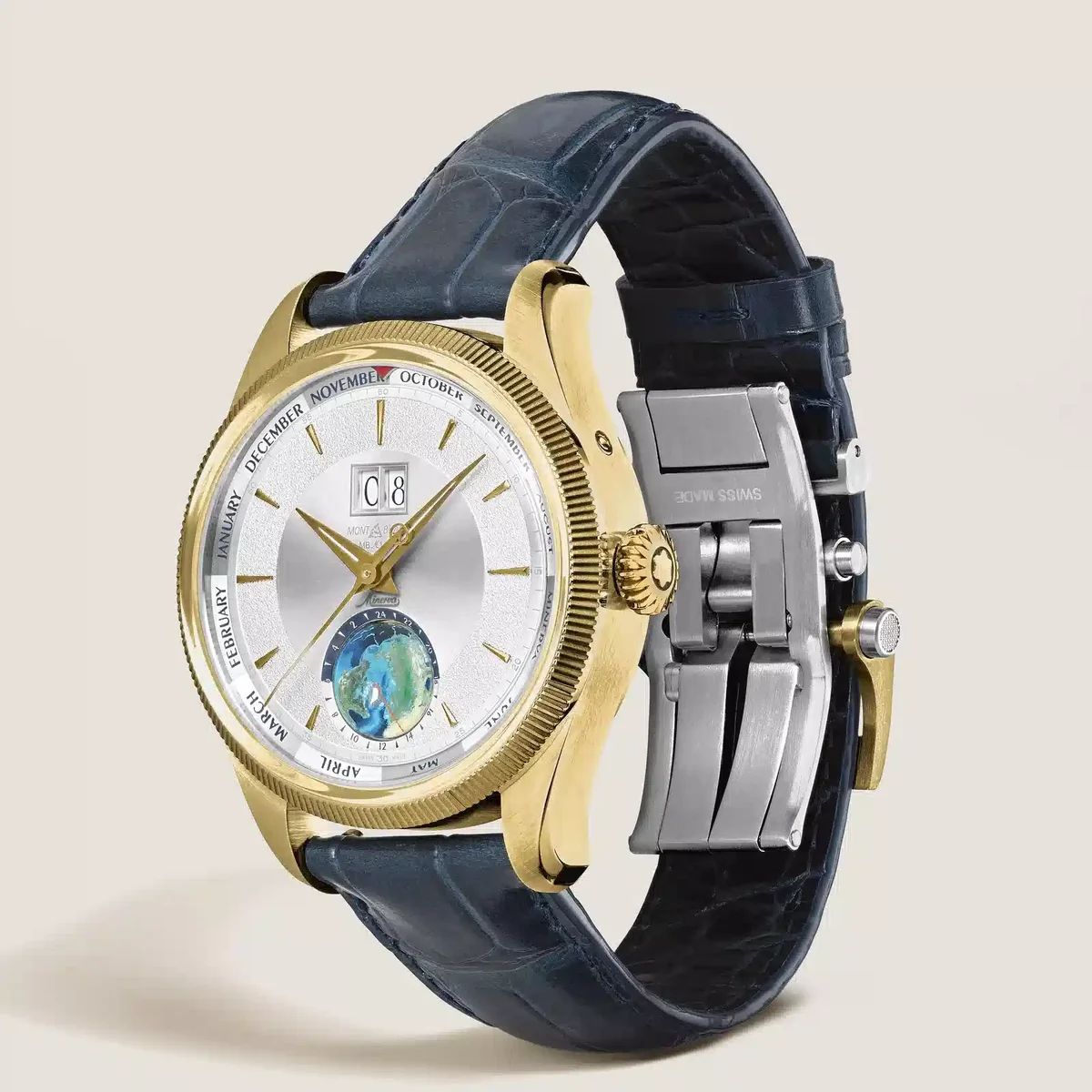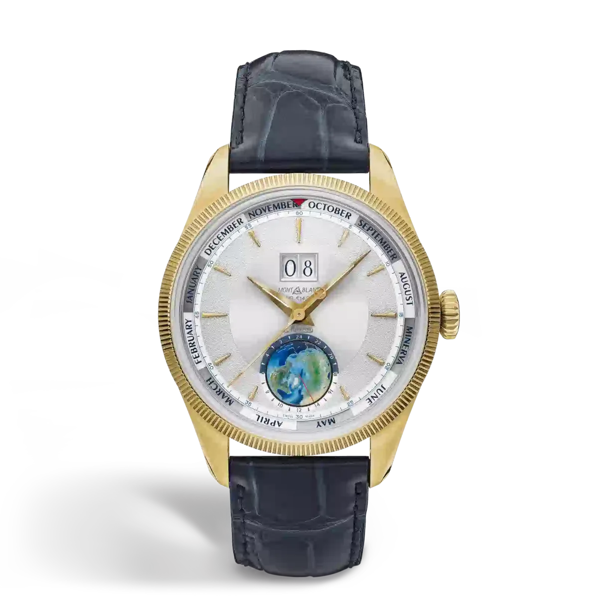 El Montblanc 1858 Annual Calendar Geosphere Limited Edition se inspira en los códigos estéticos del legado de Minerva en la década de 1950, con su esfera granulada en color blanco plateado con rayos de sol y agujas e índices recubiertos de oro amarillo. La caja de 42 mm en oro lima 750/1000 (18 quilates) está equipada con un bisel estriado fijo inspirado en los relojes históricos de Minerva. El reloj está impulsado por un calibre MB M14.58 de cuerda manual y acabado a mano, que cuenta con un calendario anual, una fecha grande y una función de hora mundial. Para las funciones del calendario anual, la fecha grande se encuentra a las 12 en punto y cuenta con dos grandes ventanas situadas una al lado de la otra, mientras que los meses se muestran alrededor de la periferia de la esfera. El punto focal visual de este reloj es, sin duda, su globo terráqueo giratorio tridimensional pintado a mano, que muestra el hemisferio norte con indicación de día y noche y una escala de 24 horas. El reloj se completa con una correa intercambiable de piel de becerro azul con estampado de cocodrilo y un cierre triple desplegable de oro lima 750/1000 (18 quilates) y acero inoxidable con sistema de ajuste fino. N.º de identificación: MB134027