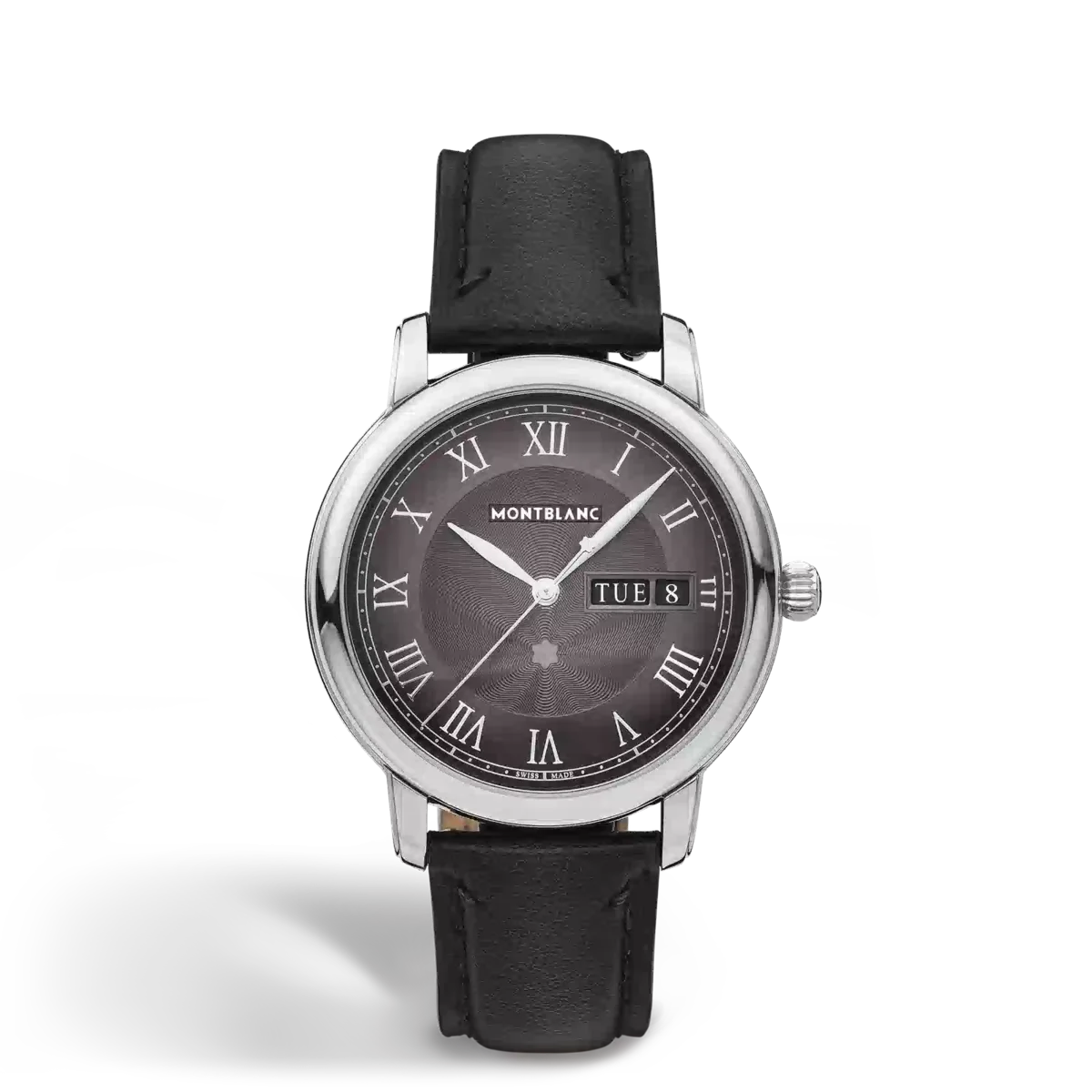 El Montblanc Star Legacy Automatic Day & Date lleva los mejores códigos de diseño de la Maison a un nuevo nivel de elegancia. El reloj presenta una esfera antracita sfumato con motivo guilloché de estrellas explosivas, filet sauté, números romanos recubiertos de rodio, agujas en forma de hoja e indica las horas, los minutos, los segundos, el día en francés o inglés y la fecha de una manera sencilla y elegante. Este modelo está impulsado por el movimiento automático MB 24.28 y se aloja en una caja de acero inoxidable de 39 mm con forma de guijarro, provista de un fondo abierto que permite ver la masa oscilante decorada con el emblema de Montblanc. La correa intercambiable de piel de becerro antracita ha sido diseñada especialmente por el director artístico de Montblanc, Marco Tomasetta, quien se inspiró en las plumillas de los instrumentos de escritura de la Maison por su forma puntiaguda, realzada con un efecto sfumato vertical.