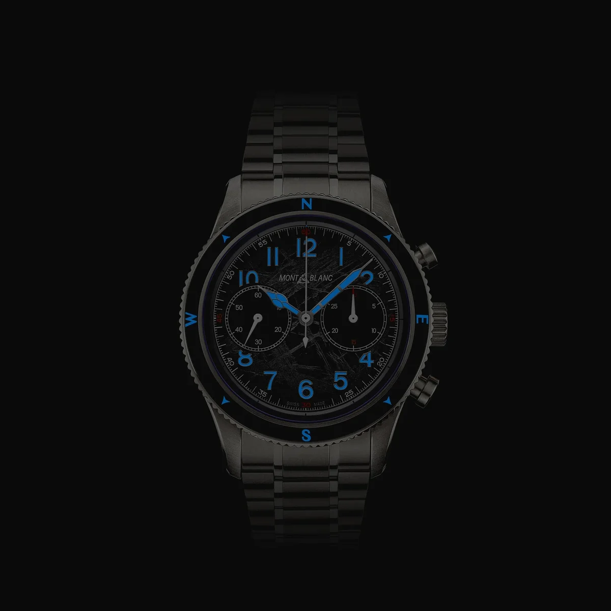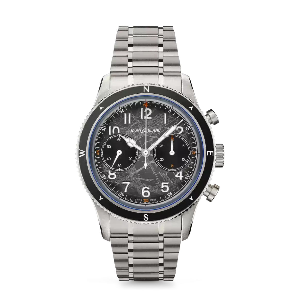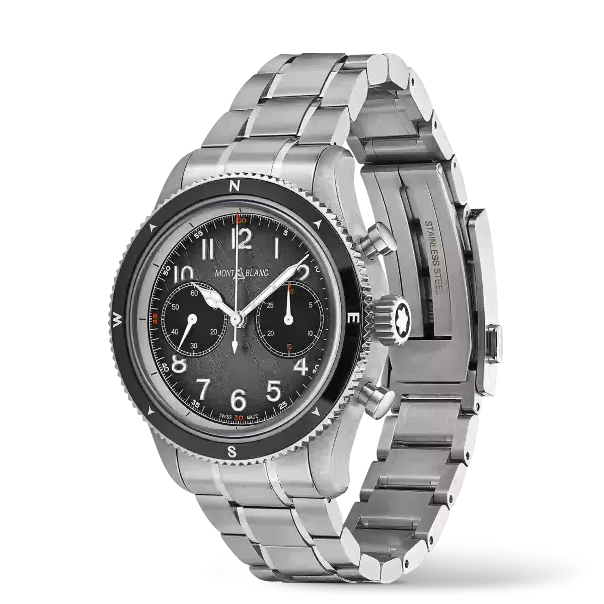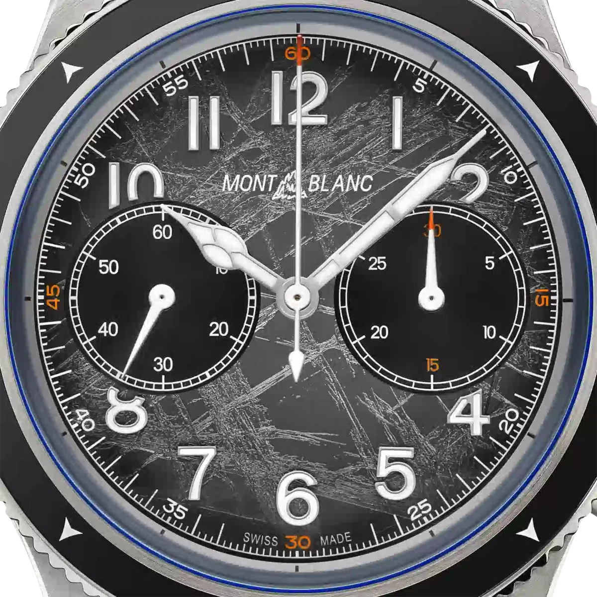 En homenaje a las cimas más altas del mundo y a los alpinistas que se atreven a escalarlas soportando condiciones extremas, el Montblanc 1858 Automatic Chronograph 0 Oxygen The 8000 se presenta en una caja de acero inoxidable de 42 mm totalmente desprovista de oxígeno. Esto ofrece varias ventajas para los exploradores, ya que elimina el empañamiento y evita la oxidación, lo que permite que el movimiento dure mucho más tiempo con mayor precisión. El reloj está impulsado por el cronógrafo automático MB 25.13 y cuenta con un bisel acanalado bidireccional de cerámica negra con puntos cardinales luminiscentes; una esfera gris oscuro con patrón de glaciar sfumato con detalles en naranja y luminiscencia azul. El fondo de la caja está grabado con el motivo «Spirit of Exploration» y el reloj está equipado con un brazalete intercambiable de acero inoxidable cónico con un sistema de ajuste fino. N.º de identificación: MB130983