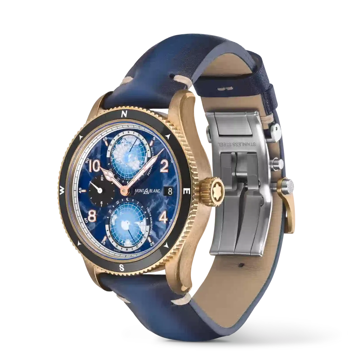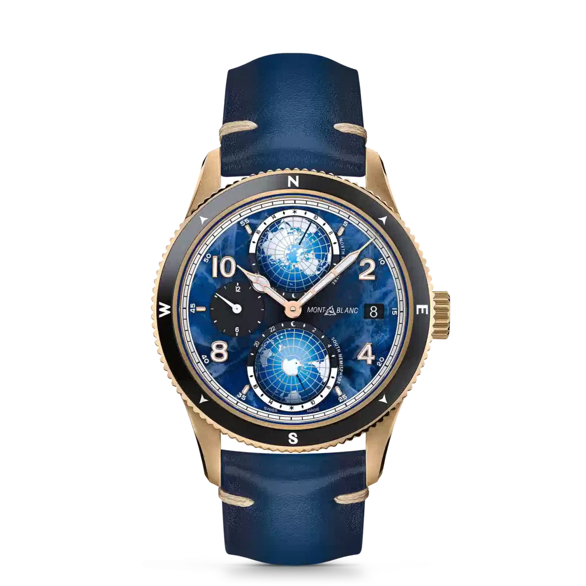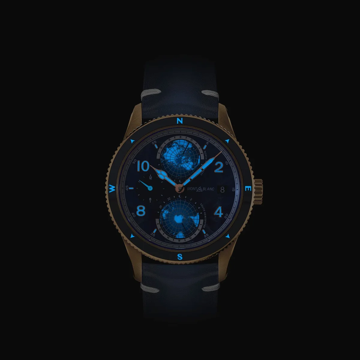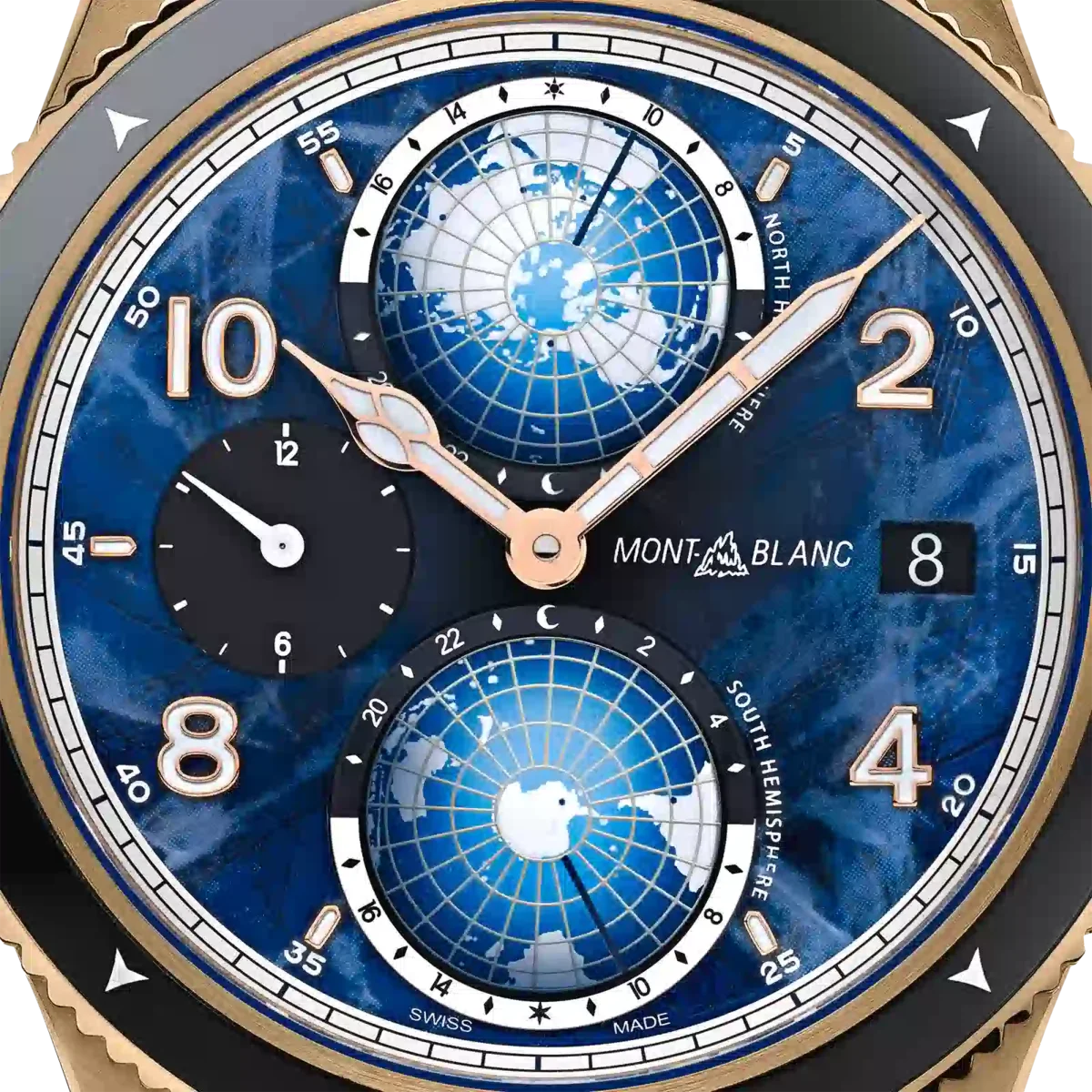 El Montblanc 1858 Geosphere 0 Oxygen Edición Limitada carece por completo de oxígeno para mejorar el rendimiento y la precisión del reloj a lo largo del tiempo, incluso en algunos de los entornos montañosos más hostiles. La ausencia total de oxígeno en el interior del movimiento no solo elimina el empañamiento, que puede producirse con los cambios drásticos de temperatura a gran altitud, sino que también evita la oxidación. Sin oxígeno, todos los componentes duran mucho más y proporcionan una mayor precisión con el paso del tiempo. El reloj presenta una caja de bronce de 42 mm con un bisel cerámico moleteado bidireccional con puntos cardinales luminiscentes y la esfera con motivo glaciar de la Maison. El reloj está impulsado por el movimiento automático MB 29.25 con complicación de manufactura. Al igual que en todos los modelos 1858 Geosphere, tanto el hemisferio norte como el sur están representados con dos globos terráqueos tridimensionales e incluyen una indicación de día y noche para que el usuario pueda ver qué hora es en todo el mundo con un simple vistazo.