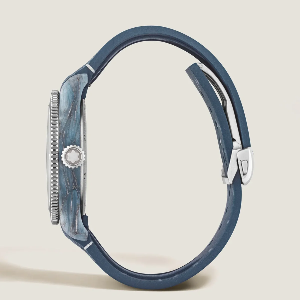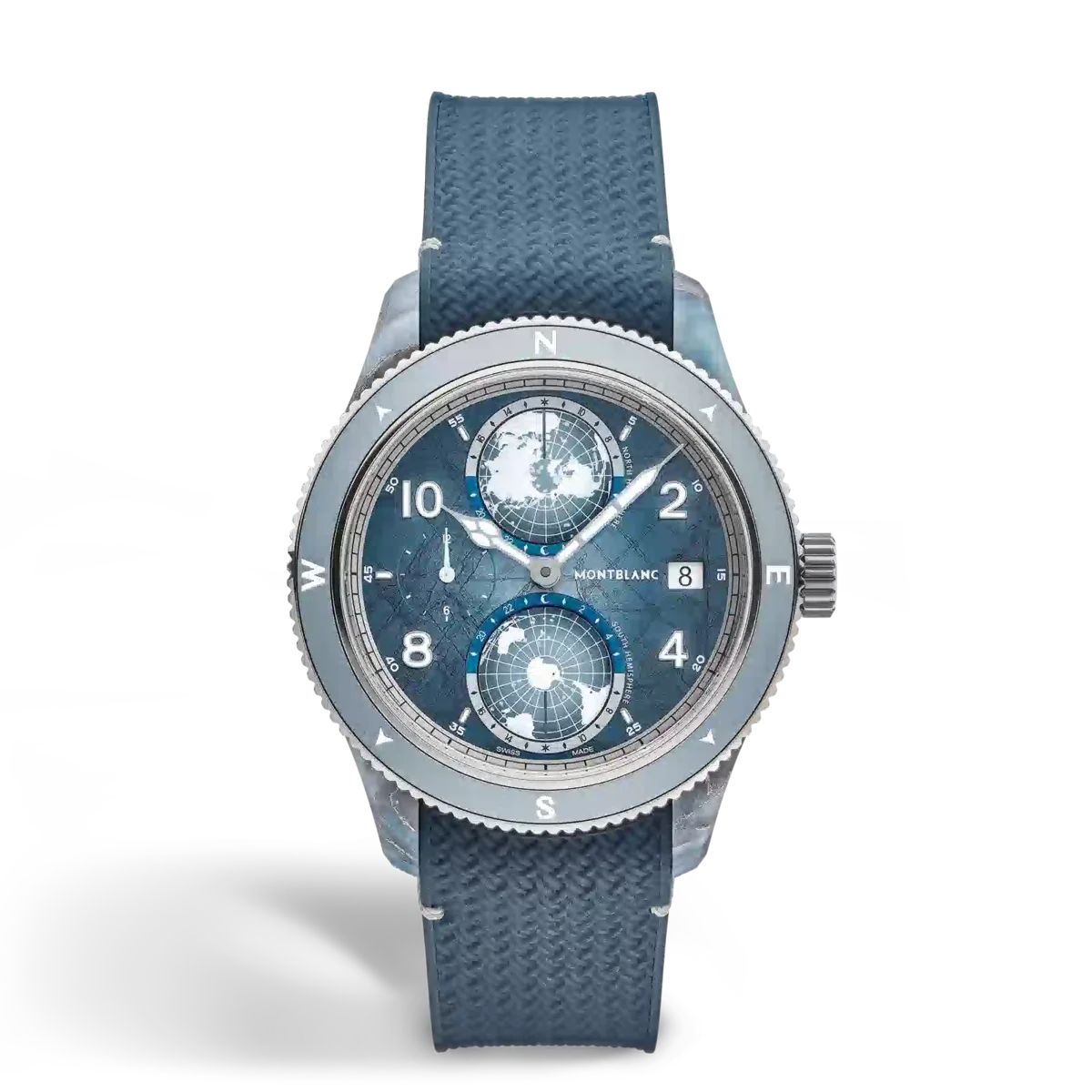 La colección 1858 Geosphere 0 Oxygen de Montblanc continúa explorando los paisajes más salvajes del planeta con una serie dedicada al alpinista y creador de marcas de Montblanc Reinhold Messner y a su hazaña de escalar las siete cimas más altas de cada uno de los siete continentes. Esta primera edición hace referencia a la séptima cima: el monte Vinson. Esta edición Geosphere 0 Oxygen está limitada a 986 piezas (en referencia a 1986, el año en que Messner ascendió al monte Vinson). Se presenta en una caja de titanio de 43,5 mm inspirada directamente en el paisaje del monte Vinson, con una caja intermedia compuesta fabricada con fibras de cuarzo, fibras de basalto aluminizadas, CaCO₃ y resina azul claro. Reforzando el tema de la aventura, la caja, totalmente desprovista de oxígeno, presenta un contorno gris luminoso grabado del monte Vinson en el lateral, mientras que un grabado láser en 3D a color de este majestuoso pico adorna el fondo de la caja de titanio. El reloj está impulsado por el movimiento automático MB 29.25 con la complicación de hora mundial de la Manufactura Montblanc, que incluye globos giratorios del hemisferio norte y sur, una escala de 24 horas, indicaciones de día y noche, doble indicación de la hora y fecha. El reloj se completa con una correa de caucho intercambiable de color azul verdoso con un sistema de ajuste fino y cónico. N.º de identificación: MB134019 Ancho de la asa: 22 mm