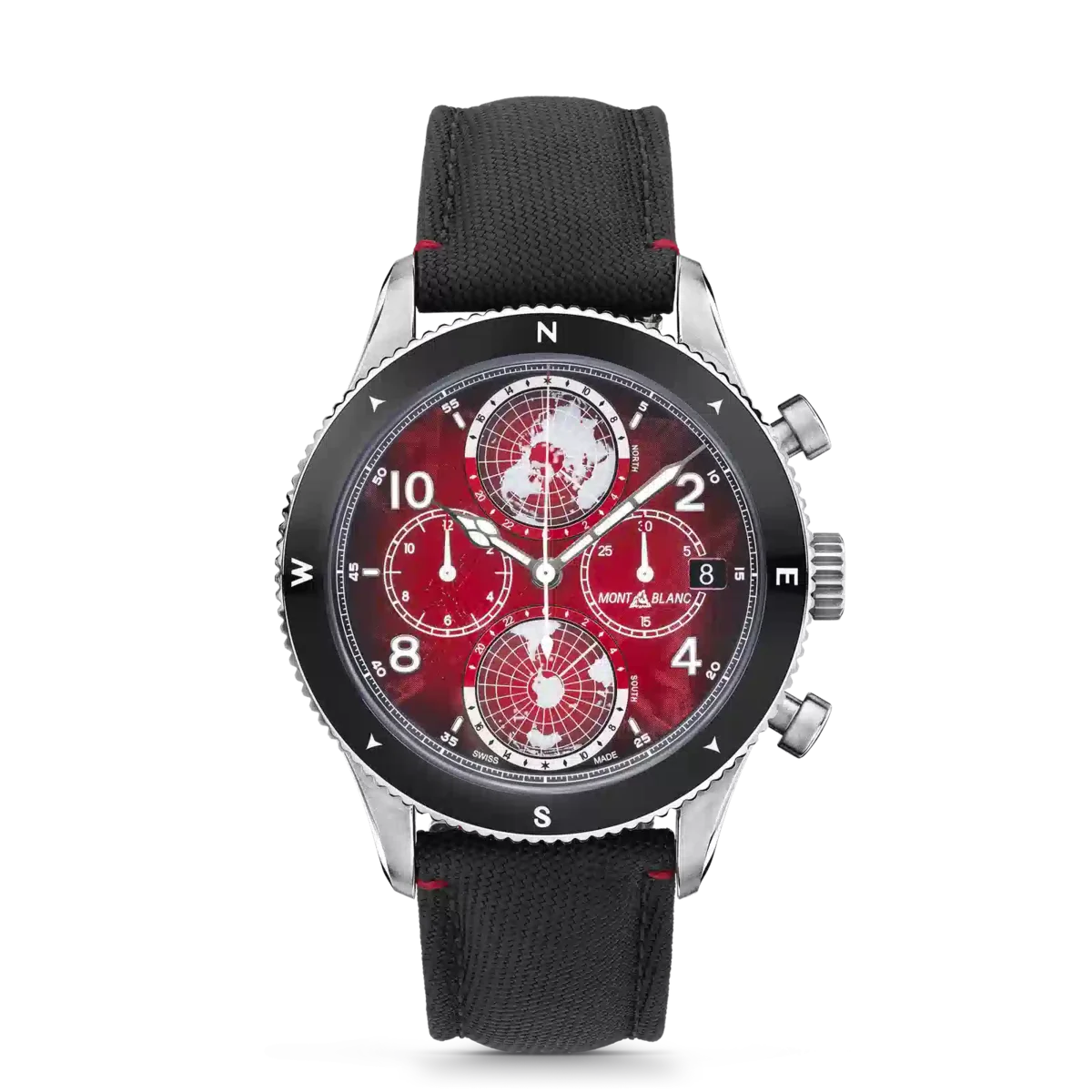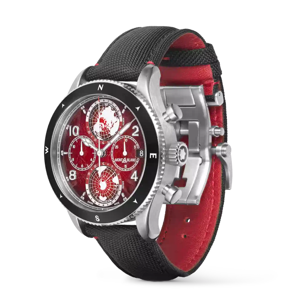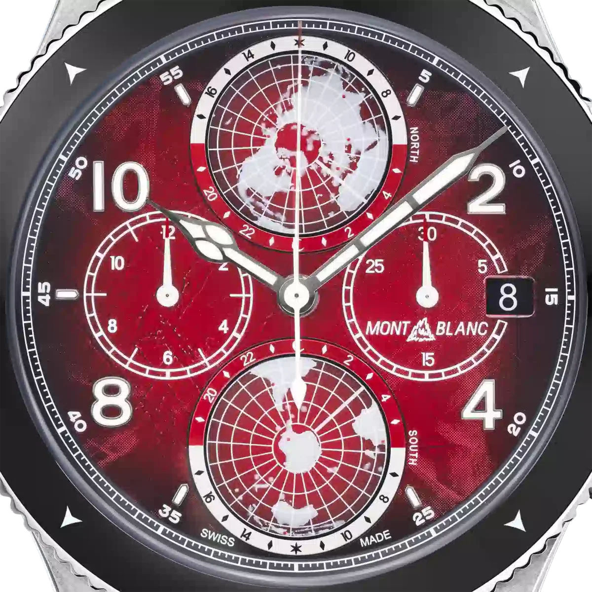 Inspirada en los glaciares rojos de la Antártida, esta edición limitada, que celebra el 80.º cumpleaños de Reinhold Messner, cuenta con una esfera con un patrón de glaciar sfumato rojo. El reloj de 44 mm ha sido encapsulado de tal manera que no hay oxígeno en su interior. Esta inusual operación tiene numerosas ventajas para los alpinistas, que necesitan que su equipo funcione a la perfección en los climas más adversos, lo que lo convierte en el modelo perfecto para rendir homenaje a Reinhold Messner y sus numerosos logros. Impulsado por el cronógrafo de la Manufactura Montblanc con complicación de hora mundial, calibre MB 29.27, este movimiento automático incluye una fecha a las 3 en punto y dos globos giratorios en 3D con el hemisferio norte a las 12 en punto y el hemisferio sur a las 6 en punto. El reloj está equipado con un bisel acanalado bidireccional de cerámica negra con puntos cardinales y una correa textil negra intercambiable con un toque de costuras rojas que recuerda las maravillas de los raros glaciares rojos. N.º de identificación: MB132303