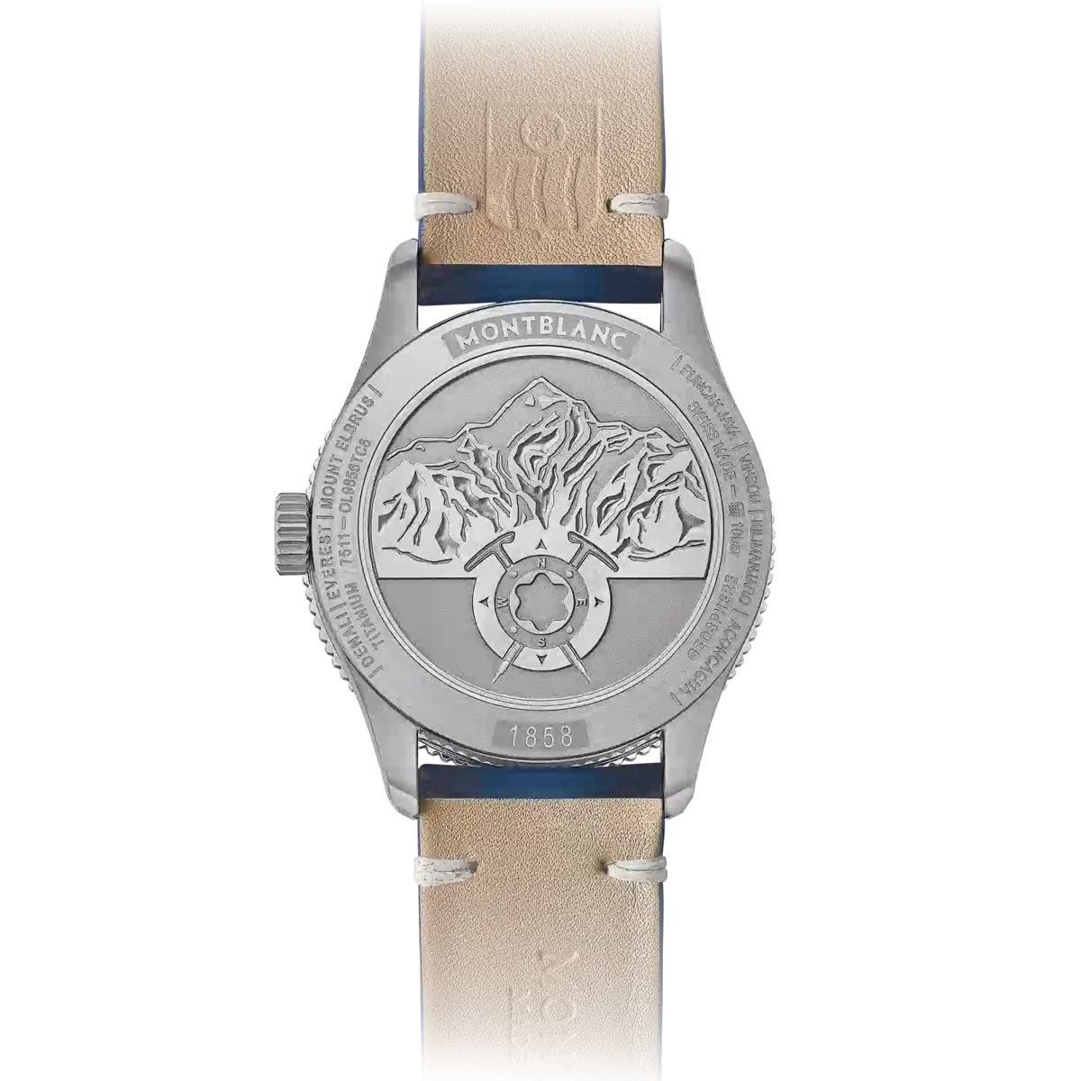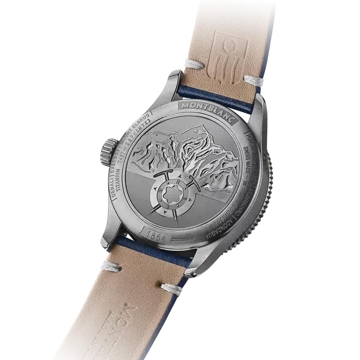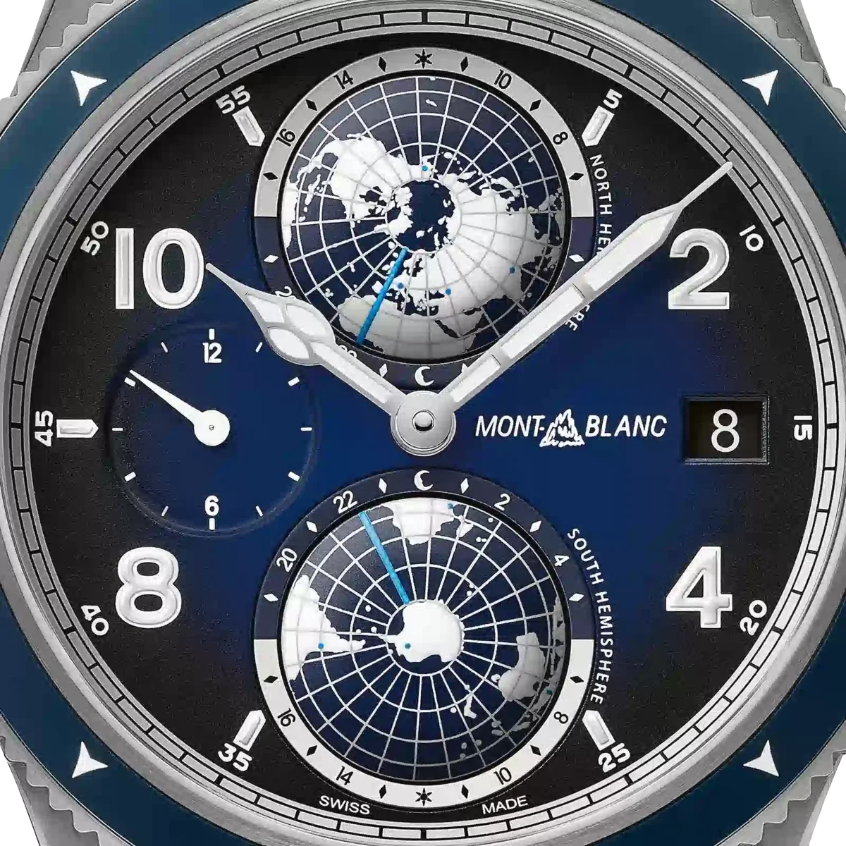 La línea de productos Montblanc 1858 se inspira en los relojes profesionales Minerva de los años 20 y 30, concebidos para uso militar y exploración. Reinterpretando estos legendarios relojes, la línea de productos Montblanc 1858 expresa el espíritu de la exploración de la montaña, encarnando la tendencia moderna de volver a la naturaleza. El Montblanc 1858 Geosphere está dedicado al reto de escalar las siete cumbres más altas del mundo, el santo grial de las aventuras de alpinismo. Se presenta en una caja de titanio de 42 mm combinada con detalles de diseño en azul y blanco hielo contrastante, inspirándose en los colores de los glaciares. El reloj cuenta con una complicación de hora mundial desarrollada por los relojeros de Montblanc en Villeret: dos globos abombados que giran en direcciones opuestas y completan una rotación completa en 24 horas. Ambos están rodeados por una escala con las 24 zonas horarias, junto con una indicación de día y noche en colores contrastantes. Esto proporciona una forma instintiva de apreciar las diferentes zonas horarias, con la ayuda de SuperLumiNova® aplicado a los continentes para aumentar la visibilidad y el rendimiento por la noche. El reloj se completa con una correa de piel de becerro azul sfumato con costuras blancas. N.º de identificación: MB125565