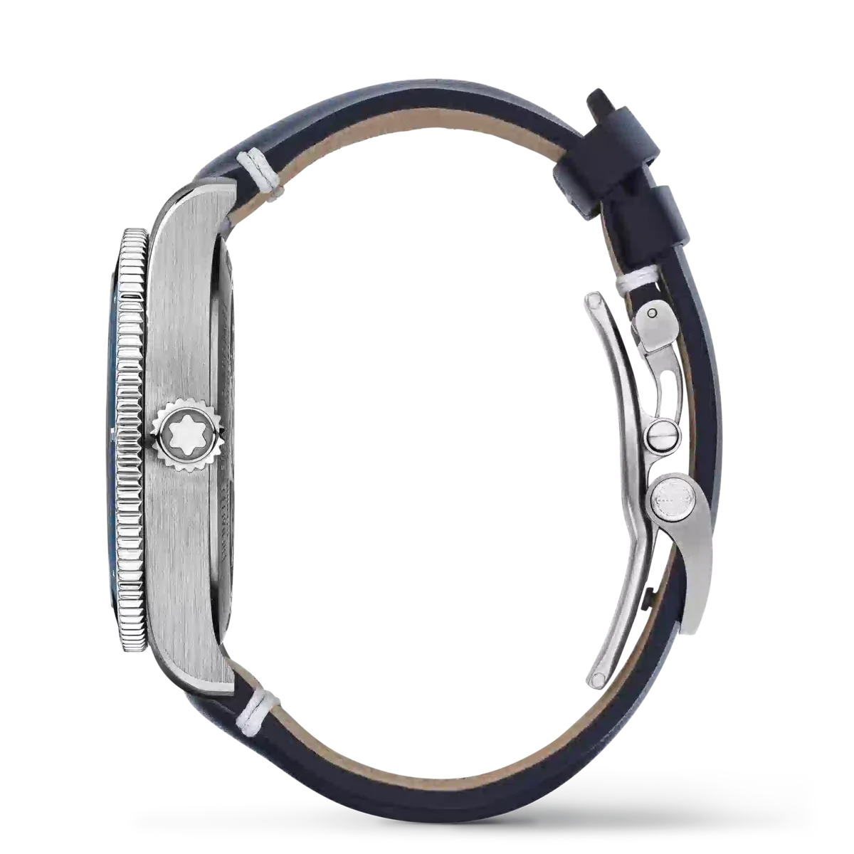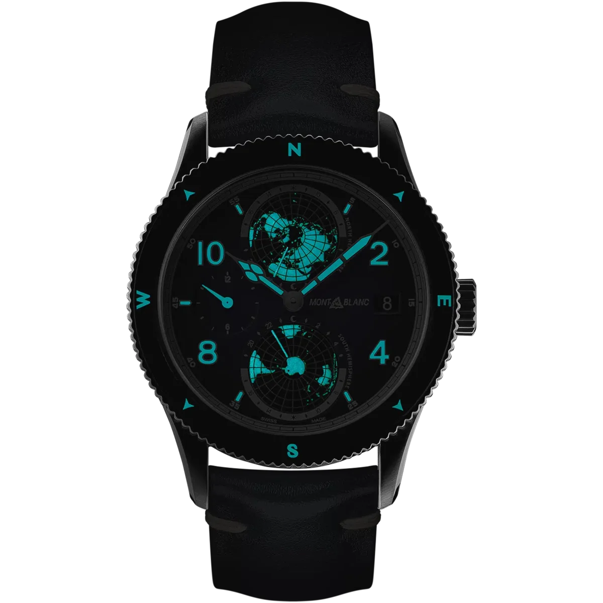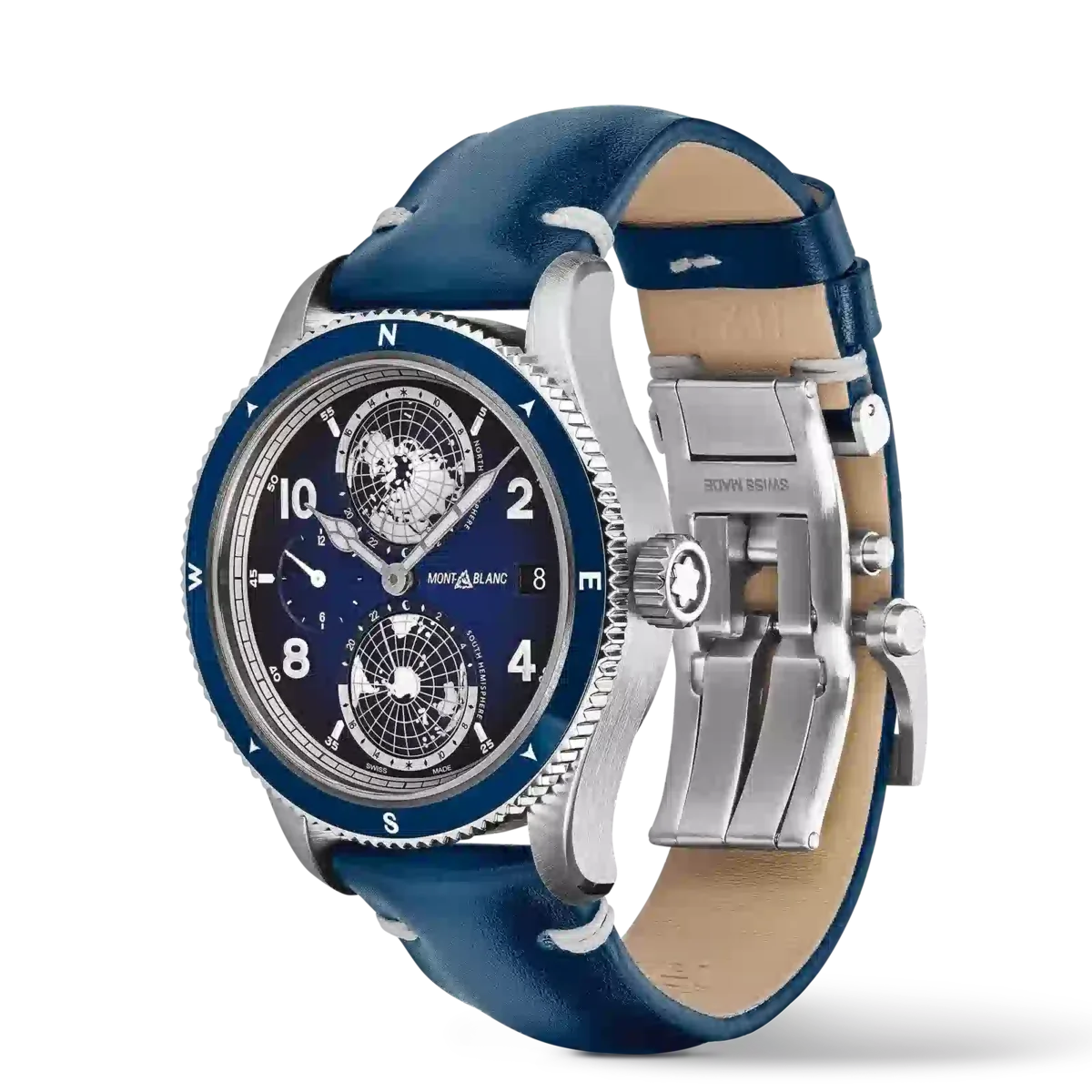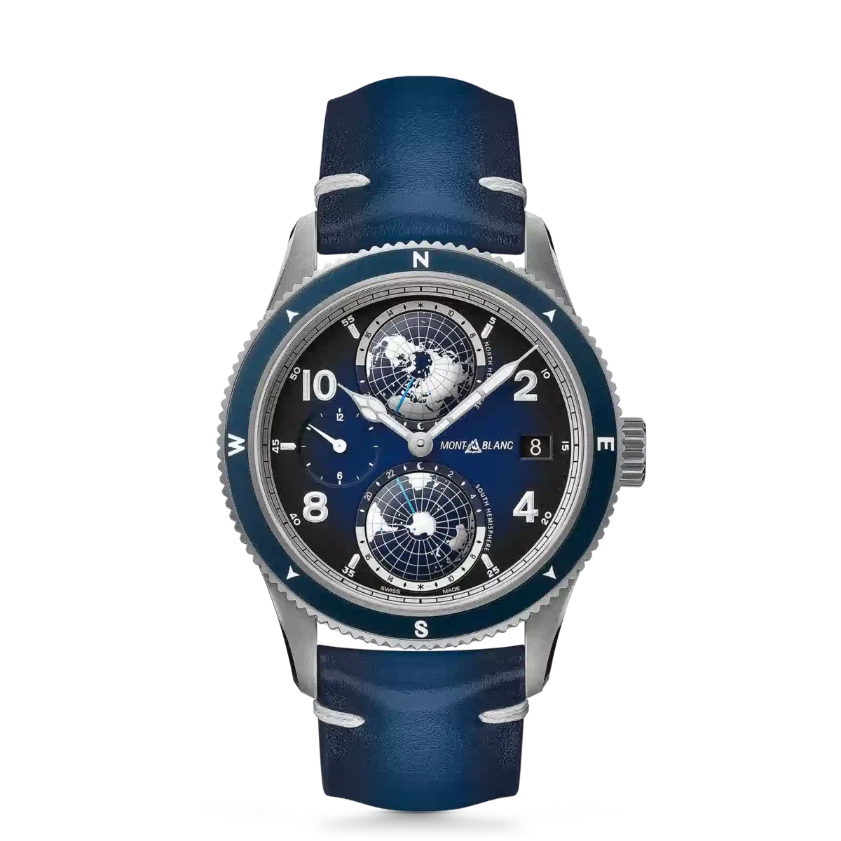 La línea de productos Montblanc 1858 se inspira en los relojes profesionales Minerva de los años 20 y 30, concebidos para uso militar y exploración. Reinterpretando estos legendarios relojes, la línea de productos Montblanc 1858 expresa el espíritu de la exploración de la montaña, encarnando la tendencia moderna de volver a la naturaleza. El Montblanc 1858 Geosphere está dedicado al reto de escalar las siete cumbres más altas del mundo, el santo grial de las aventuras de alpinismo. Se presenta en una caja de titanio de 42 mm combinada con detalles de diseño en azul y blanco hielo contrastante, inspirándose en los colores de los glaciares. El reloj cuenta con una complicación de hora mundial desarrollada por los relojeros de Montblanc en Villeret: dos globos abombados que giran en direcciones opuestas y completan una rotación completa en 24 horas. Ambos están rodeados por una escala con las 24 zonas horarias, junto con una indicación de día y noche en colores contrastantes. Esto proporciona una forma instintiva de apreciar las diferentes zonas horarias, con la ayuda de SuperLumiNova® aplicado a los continentes para aumentar la visibilidad y el rendimiento por la noche. El reloj se completa con una correa de piel de becerro azul sfumato con costuras blancas. N.º de identificación: MB125565