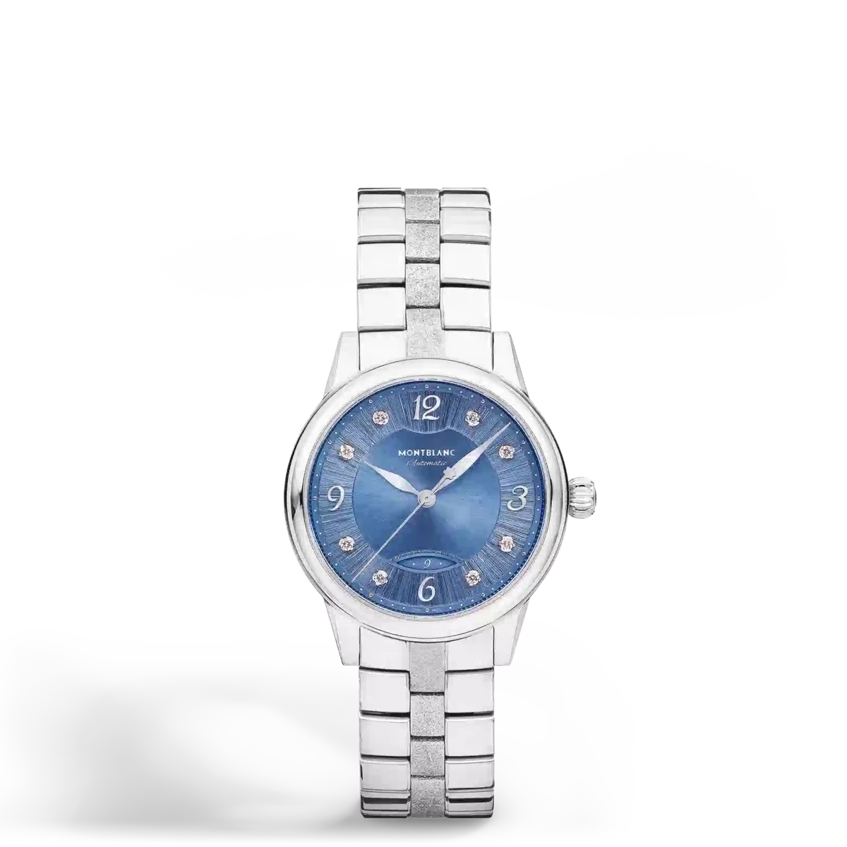 Interpretando los códigos de la alta relojería de una manera elegante y femenina, el Montblanc Bohème Automatic Date se inspira en el mundo de la escritura a mano y se presenta en una caja de acero inoxidable de 30 mm. Cuenta con una elegante esfera azul con acabado cepillado adornada con índices de diamantes, números arábigos florales recubiertos de rodio y agujas. Otros detalles refinados incluyen un patrón filet sauté y una técnica de estampado llamada filé d’étoiles. Equipado con el calibre automático MB 24.29, este modelo indica las horas, los minutos y los segundos, así como la fecha, que se muestra en una ventanilla almendrada con números escritos a mano. La romántica tipografía también se ha aplicado a la esfera para la mención «Automatic». Este reloj está equipado con un brazalete intercambiable de acero inoxidable con un eslabón central texturizado y un sistema de ajuste fino. N.º de identificación: MB134341