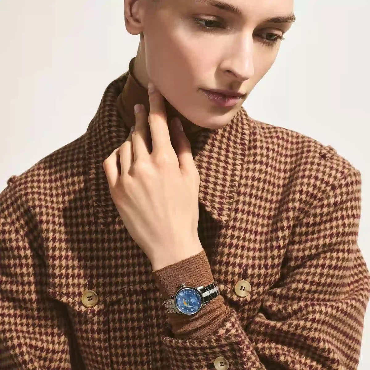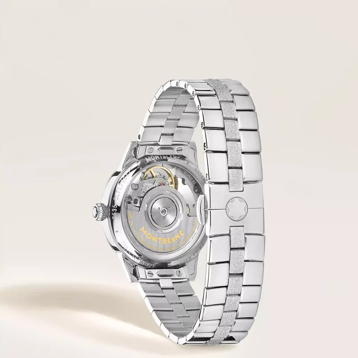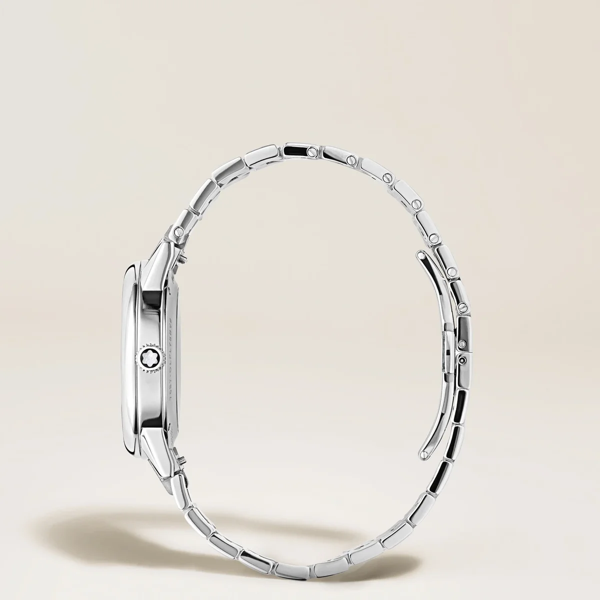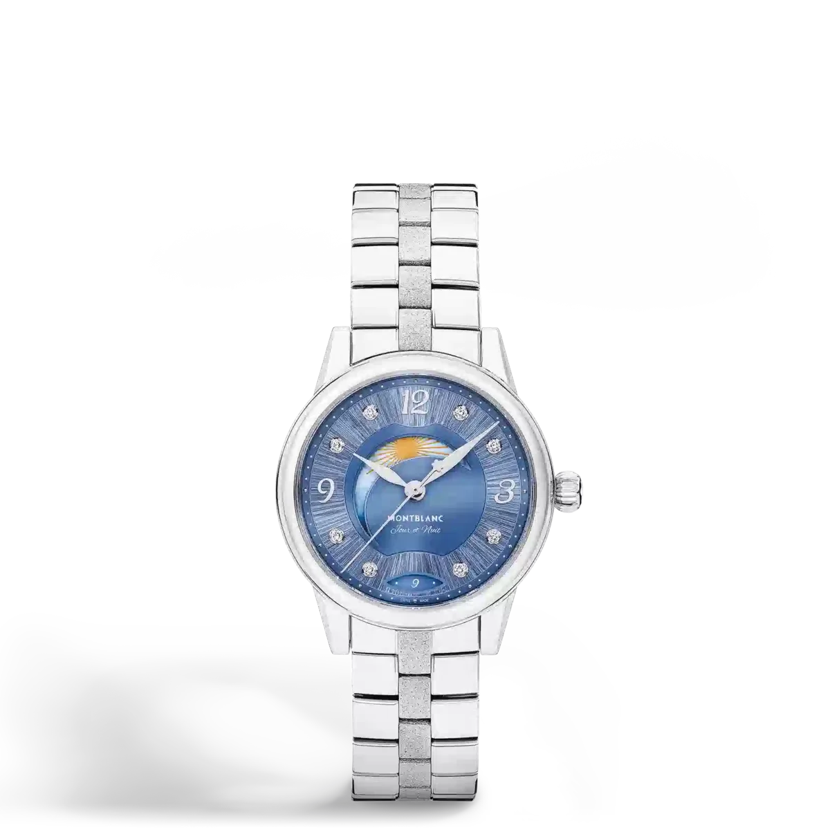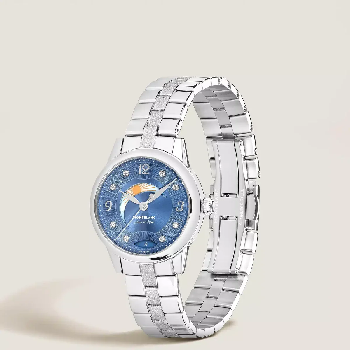 Interpretando los códigos de la alta relojería de una manera elegante y femenina, el Montblanc Bohème Day & Night se inspira en el mundo de la caligrafía y las acuarelas y se presenta en una caja de acero inoxidable de 30 mm. Cuenta con una elegante esfera azul con acabado cepillado adornada con índices de diamantes, números arábigos florales recubiertos de rodio y agujas. Otros detalles refinados incluyen un patrón filet sauté y una técnica de estampado llamada filé d’étoiles. Equipado con el calibre automático MB 24.20, este modelo indica las horas, los minutos y los segundos, así como la fecha, que se muestra en una ventana almendrada con números escritos a mano. La romántica tipografía también se ha aplicado a la esfera para la mención del día y la noche «Jour et Nuit». La complicación celestial de día y noche muestra los cambios del cielo a lo largo de un periodo de 24 horas y aporta un toque romántico y artístico al reloj, ya que está creada con acuarelas. Este reloj está equipado con un brazalete intercambiable de acero inoxidable con un eslabón central texturizado y un sistema de ajuste fino. N.º de identificación: MB134342