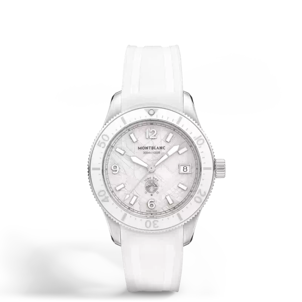 El Montblanc Iced Sea Automatic Date 0 Oxygen, con esfera blanca con motivo glaciar, da la impresión de estar contemplando las profundidades de un glaciar. Inspirada en el Mer de Glace, esta textura glacial se ha conseguido utilizando una técnica ancestral casi olvidada llamada gratté-boisé. El reloj está alojado en una caja de acero inoxidable de 38 mm totalmente desprovista de oxígeno y viene con un bisel giratorio unidireccional con inserción de cerámica blanca, un grabado en 3D en el fondo de la caja y una correa de caucho blanco intercambiable con sistema de ajuste fino. El reloj cumple con la norma ISO 6425 para el buceo y tiene una resistencia al agua de 300 metros. N.º de identificación: MB134025 Ancho de la asa: 19 mm