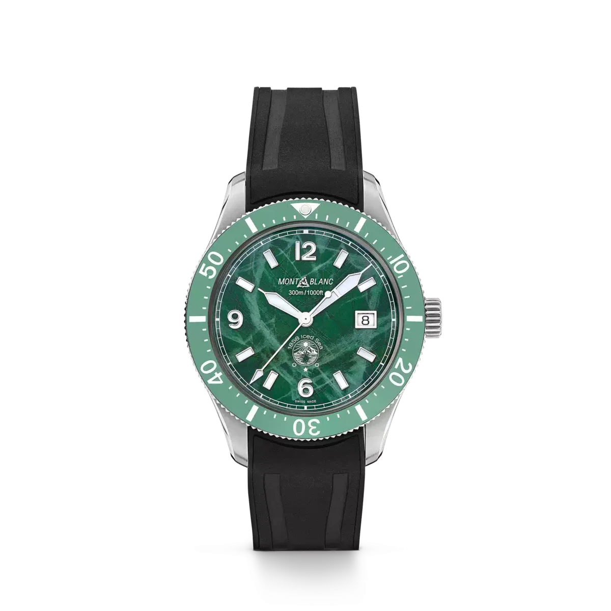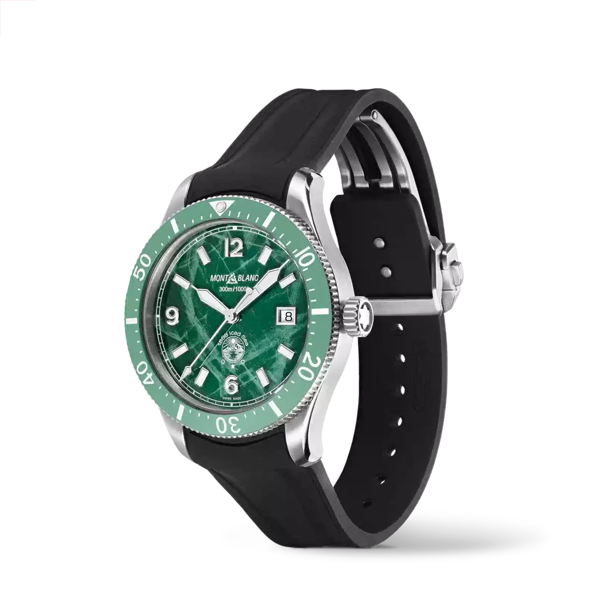 El Montblanc Iced Sea Automatic Date, el primer reloj de buceo deportivo de Montblanc, presenta una esfera con motivo glaciar que da la impresión de estar mirando a las profundidades de un glaciar. Esta esfera verde con diseño glacial se inspira en el Mer de Glace (Mar de Hielo), el glaciar principal del macizo del Mont Blanc. Su textura se ha conseguido utilizando una técnica ancestral casi olvidada llamada gratté-boisé. El reloj tiene una caja de acero inoxidable de 41 mm y cuenta con un bisel cerámico bicolor unidireccional, un fondo grabado y una correa de caucho negro intercambiable con sistema de ajuste fino. El reloj cumple con la norma ISO 6425 para relojes de buceo y es resistente al agua hasta 300 metros. N.º de identificación: MB129765 Ancho de la asa: 20 mm