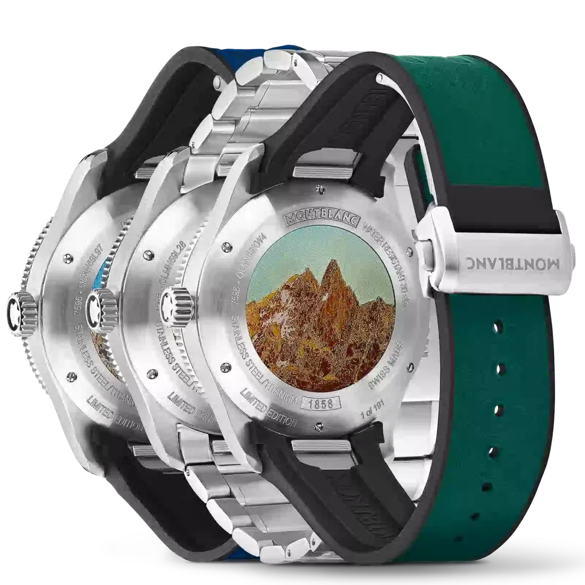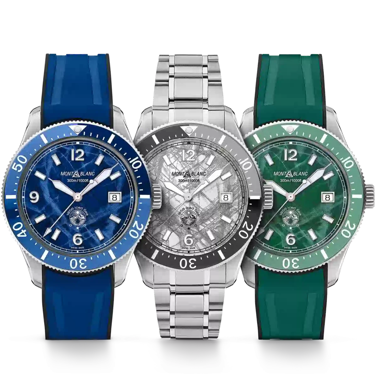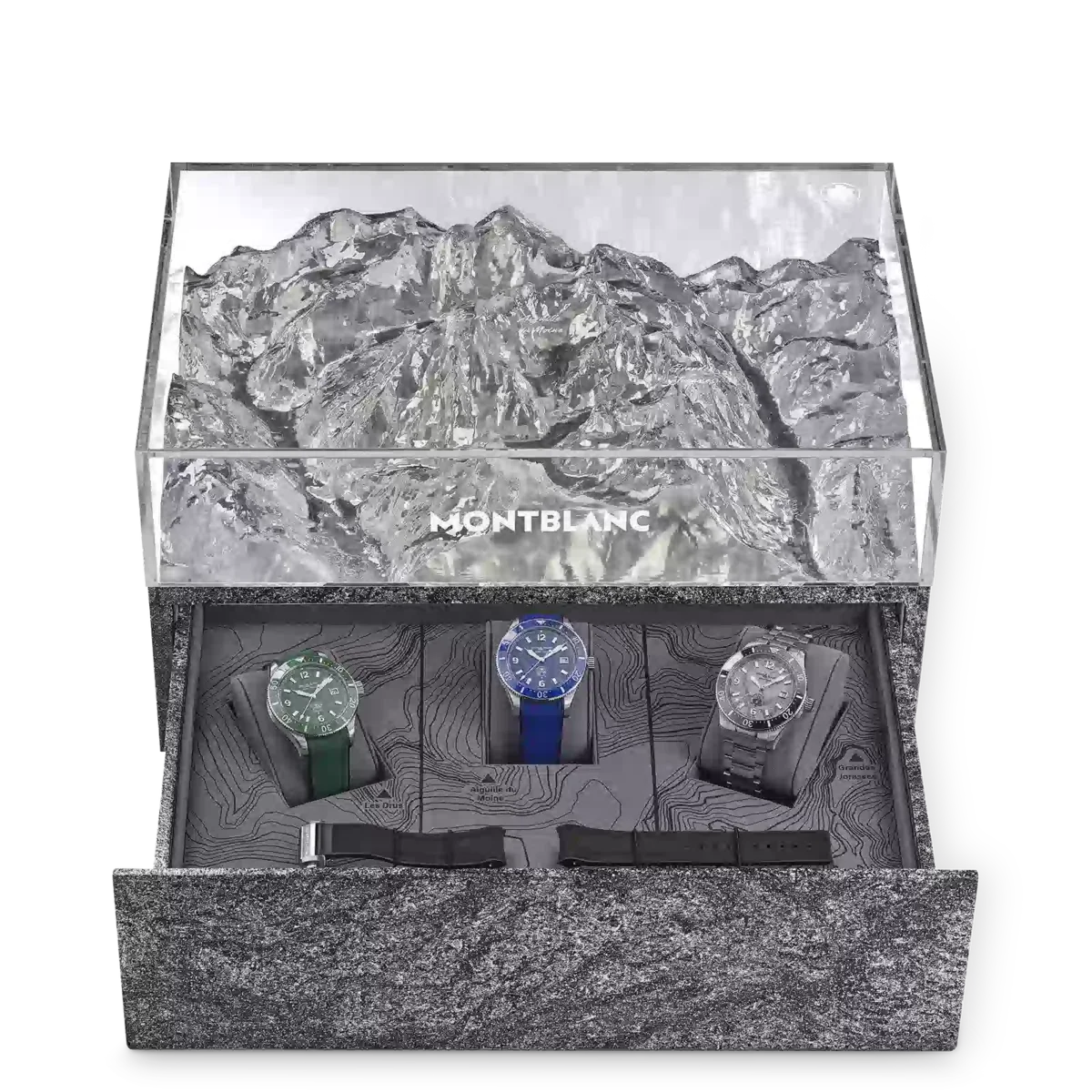 El Montblanc Iced Sea Automatic Date Coffret incluye tres ediciones Iced Sea en azul, verde y gris. Cada modelo es diferente de las ediciones estándar, ya que presenta un grabado láser en color de las montañas del macizo del Mont Blanc. Los tres relojes se presentan en un estuche decorativo con una base similar al granito, que representa la roca de la montaña del Mont Blanc, y una tapa de Plexiglas® grabada con láser para mostrar el relieve del macizo del Mont Blanc en su interior. El cofre viene con una pulsera de acero inoxidable y tres correas de caucho intercambiables de diferentes colores. Este cofre de edición limitada de 191 piezas está disponible exclusivamente en las boutiques Montblanc. N.º de identificación: MB131326