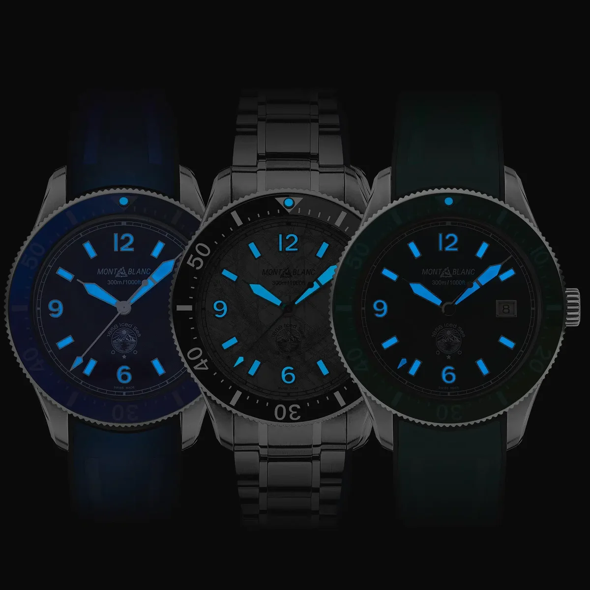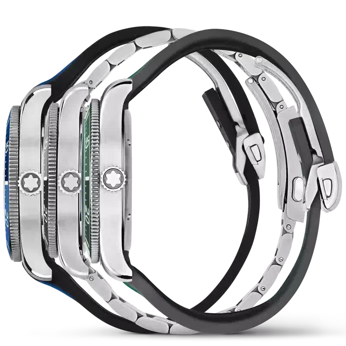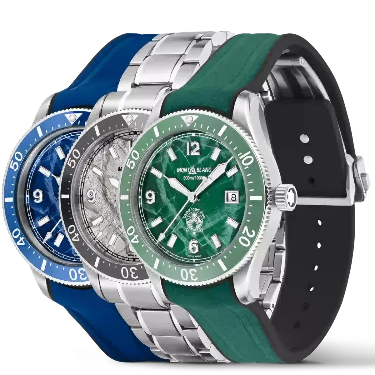 El Montblanc Iced Sea Automatic Date Coffret incluye tres ediciones Iced Sea en azul, verde y gris. Cada modelo es diferente de las ediciones estándar, ya que presenta un grabado láser en color de las montañas del macizo del Mont Blanc. Los tres relojes se presentan en un estuche decorativo con una base similar al granito, que representa la roca de la montaña del Mont Blanc, y una tapa de Plexiglas® grabada con láser para mostrar el relieve del macizo del Mont Blanc en su interior. El cofre viene con una pulsera de acero inoxidable y tres correas de caucho intercambiables de diferentes colores. Este cofre de edición limitada de 191 piezas está disponible exclusivamente en las boutiques Montblanc. N.º de identificación: MB131326
