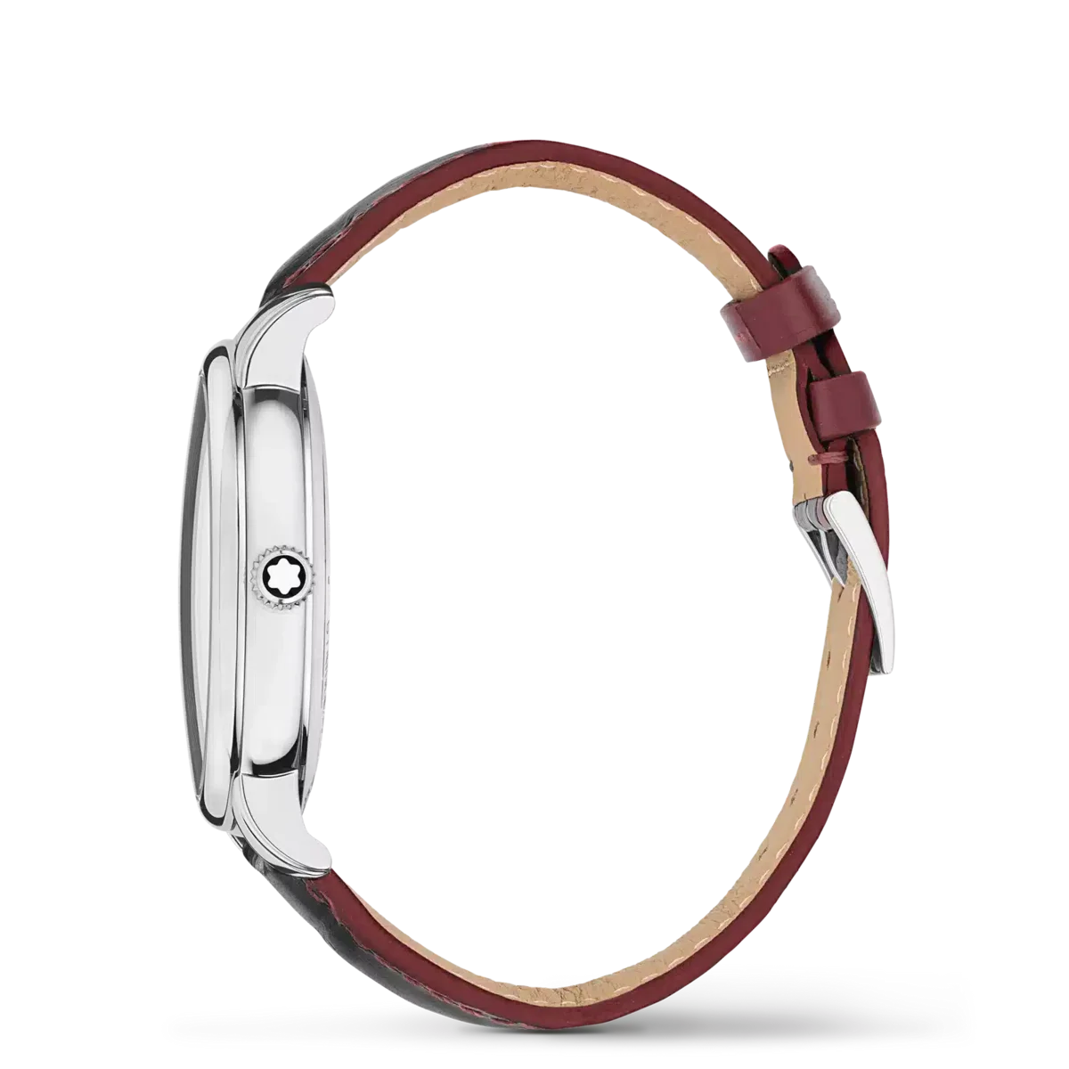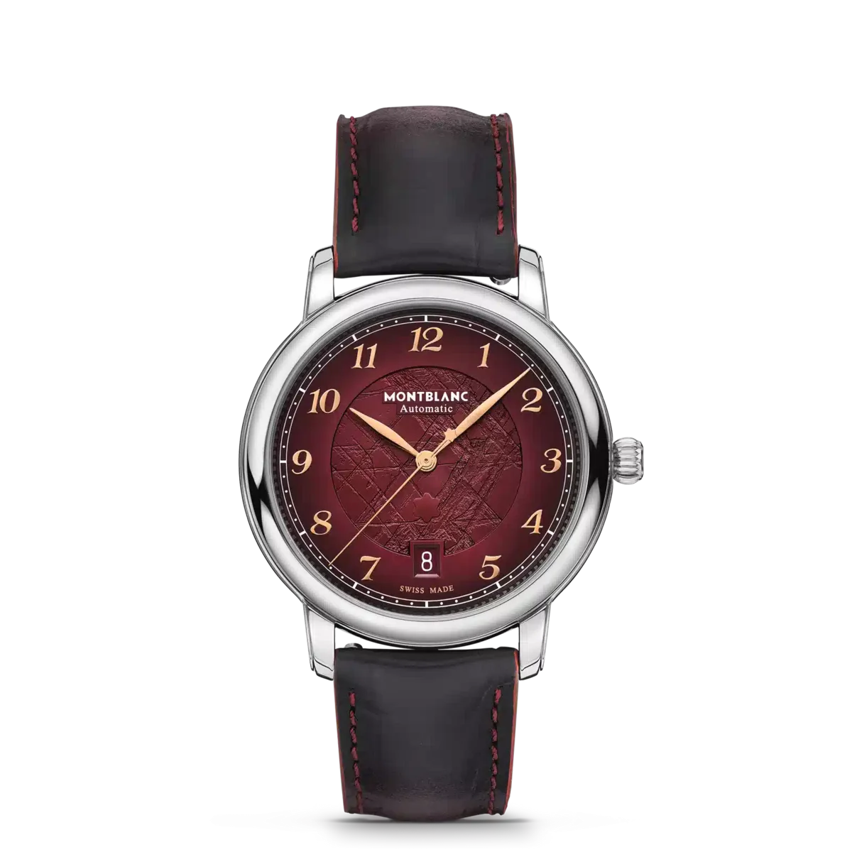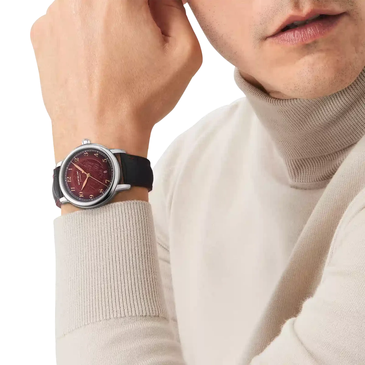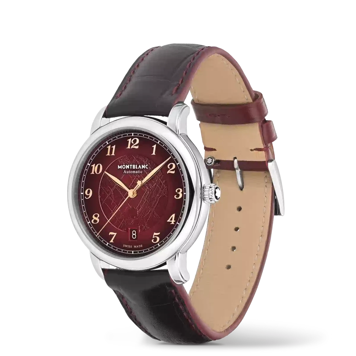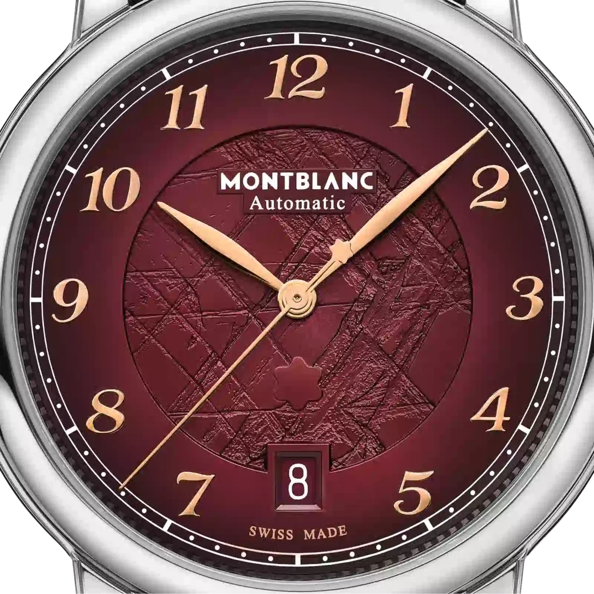 El Montblanc Star Legacy Automatic Date Limited Edition, con una tirada limitada de 1786 piezas, rinde homenaje al intrépido Jacques Balmat, quien fue el primero en alcanzar la cima del Mont Blanc en 1786. El reloj presenta una esfera con diseño de glaciar en tono burdeos con efecto sfumato alrededor del borde exterior, filet sauté, agujas y números recubiertos de oro rosa y el emblema de Montblanc en el contrapeso del segundero. Este modelo está impulsado por el movimiento automático MB 24.17 e indica las horas, los minutos, los segundos y la fecha. El reloj tiene una caja de acero inoxidable de 39 mm con fondo abierto en el movimiento y viene con una correa intercambiable de piel de becerro con estampado de cocodrilo y sfumato vertical.
