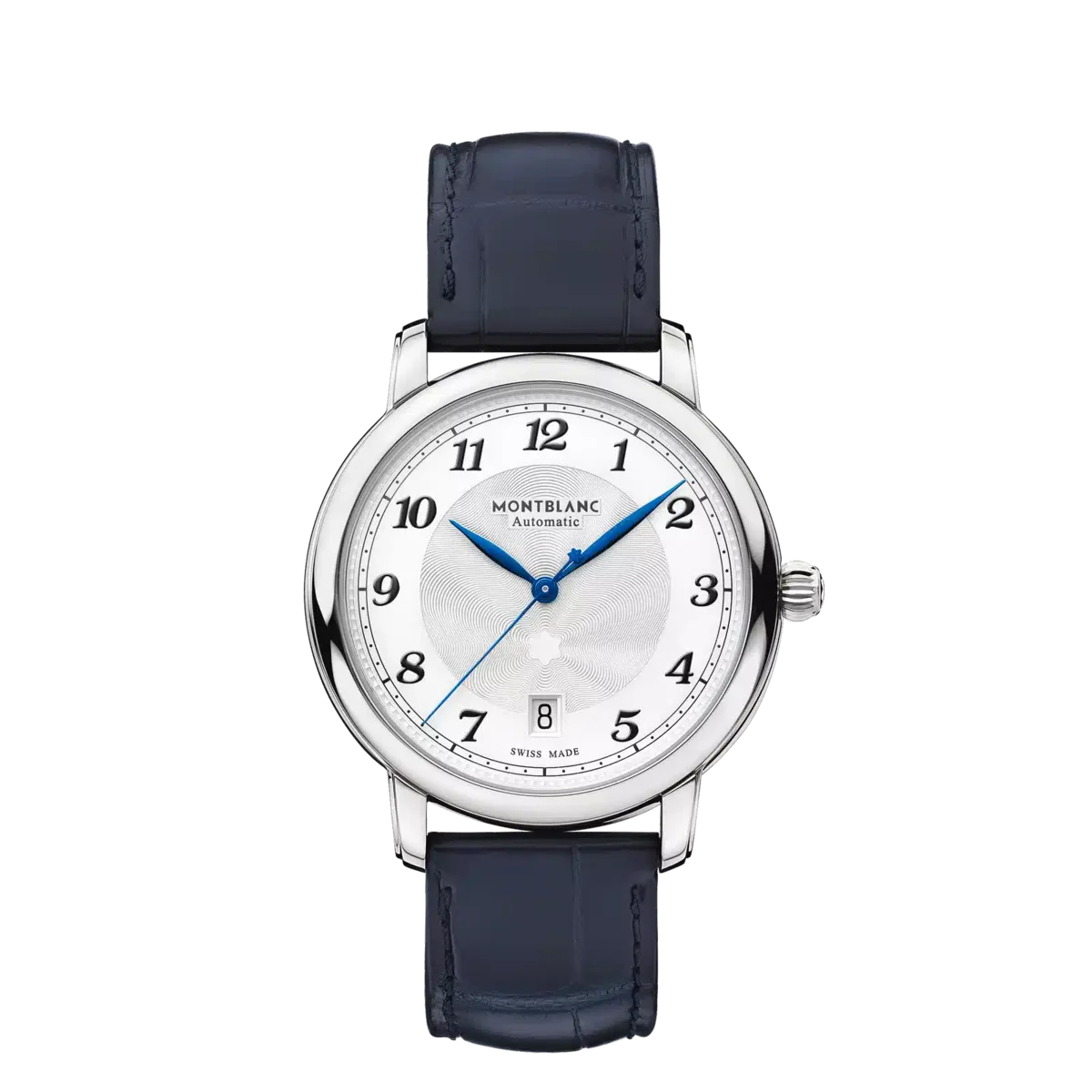 Para celebrar el 20.º aniversario de la colección Montblanc Star este año, la Maison reinventa su icónica colección con relojes inspirados en el extraordinario patrimonio de la Manufactura Minerva, reinterpretando tanto la estética como la tecnología de la colección. El Star Legacy Automatic Date es el reloj más puro de la colección. Muestra todos los códigos de diseño de la línea, incluyendo una esfera refinada con el icónico patrón guilloché de estrella explosiva de Montblanc, agujas de horas y minutos en forma de hoja, números arábigos rediseñados al estilo Breguet que recuerdan a los históricos relojes de bolsillo Minerva, un filet sauté (líneas guilloché ascendentes y descendentes), una exclusiva escala de minutos tipo ferrocarril y un segundero con el emblema de Montblanc en su extremo. El reloj tiene una caja de acero inoxidable de 39 mm, una esfera blanco plateada y una correa de piel de cocodrilo azul elaborada por Montblanc Pelletteria en Florencia, Italia. N.º de identificación: MB117574 Ancho de la asa: 19 mm