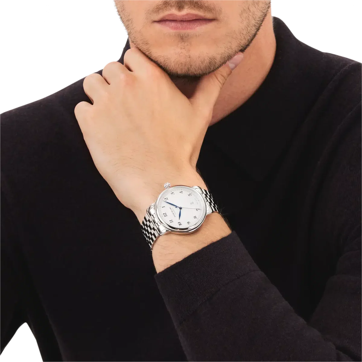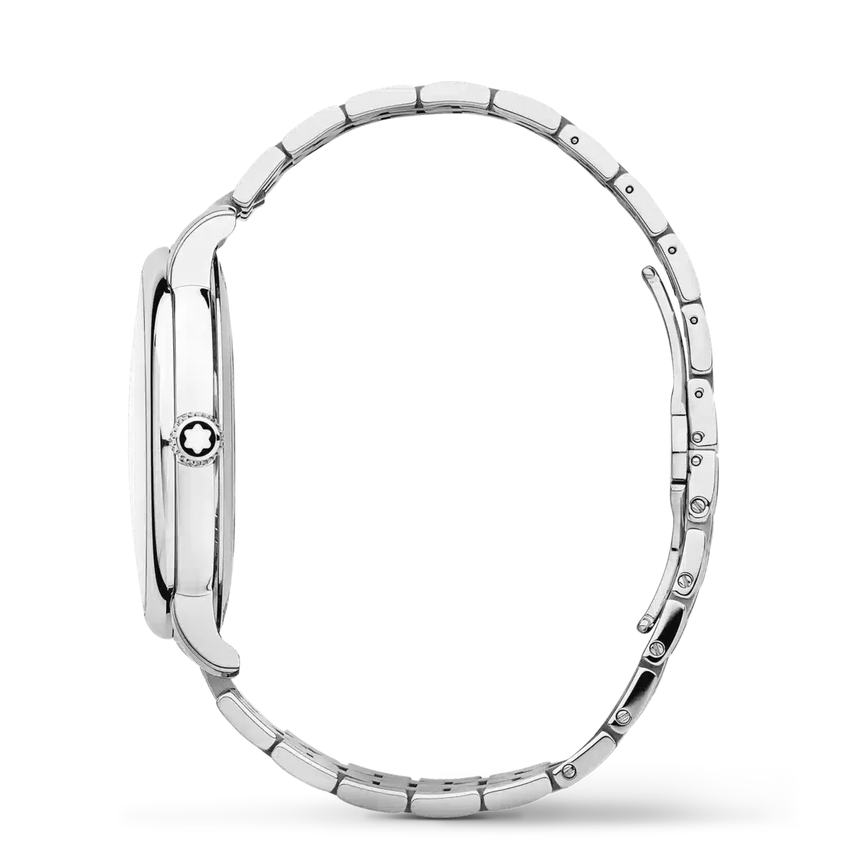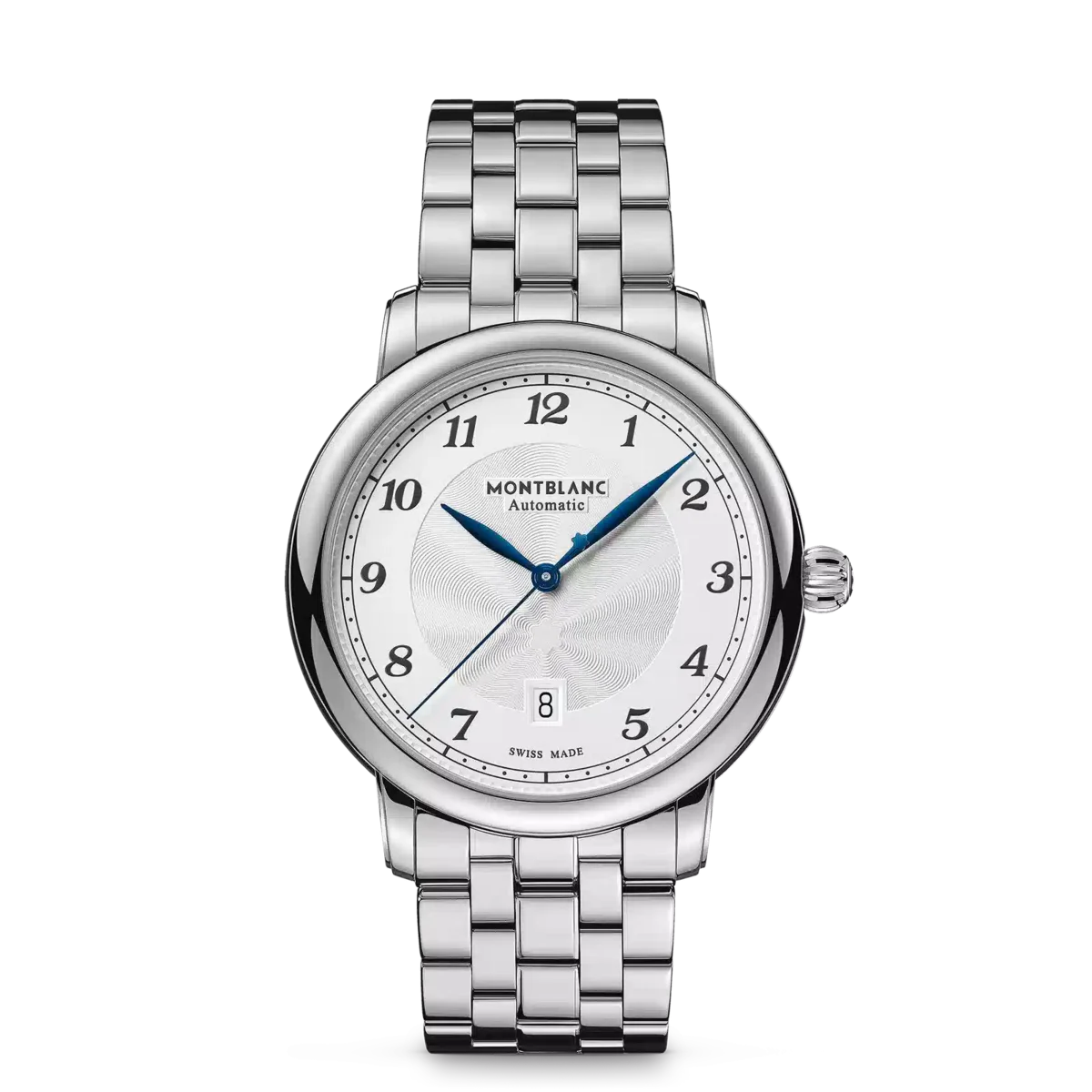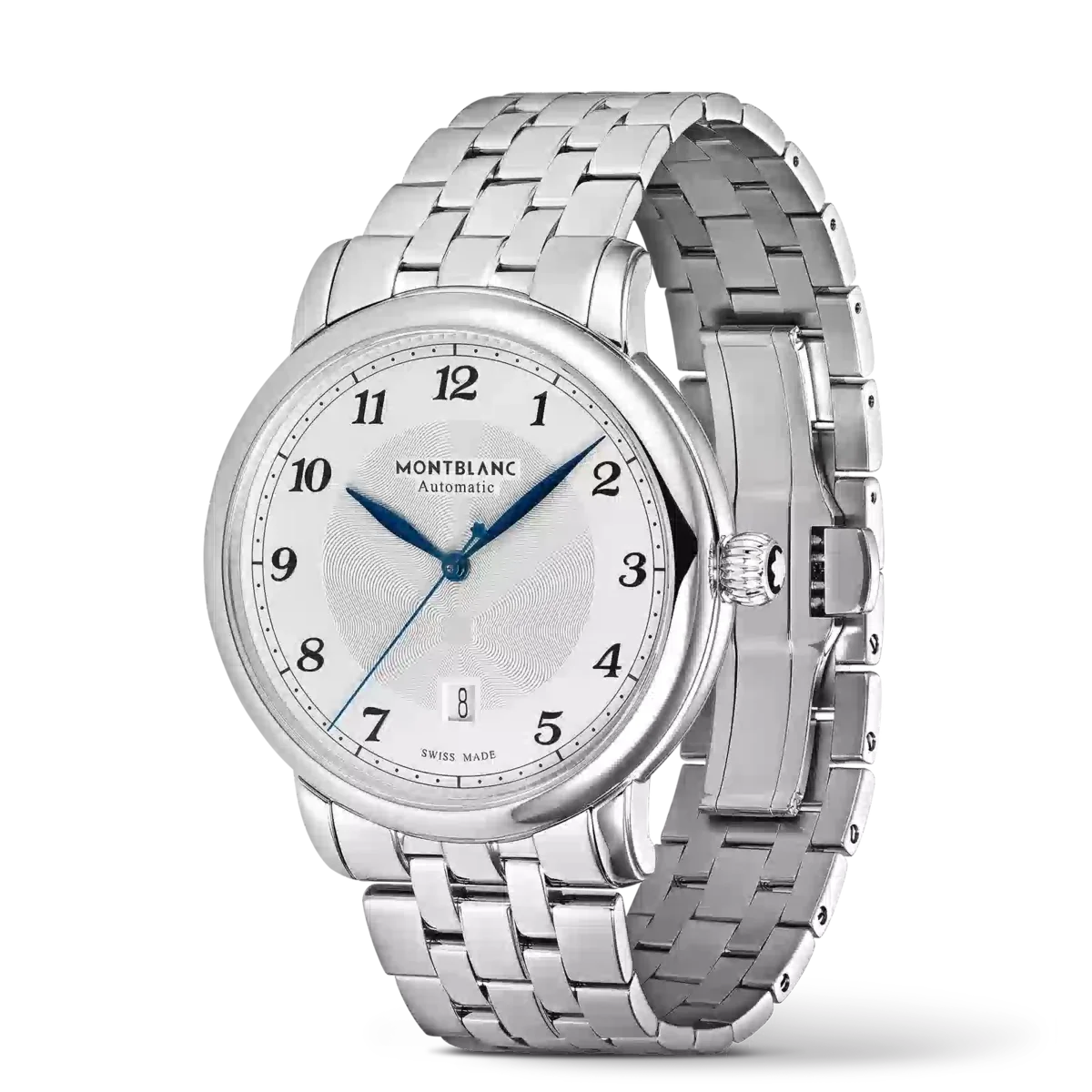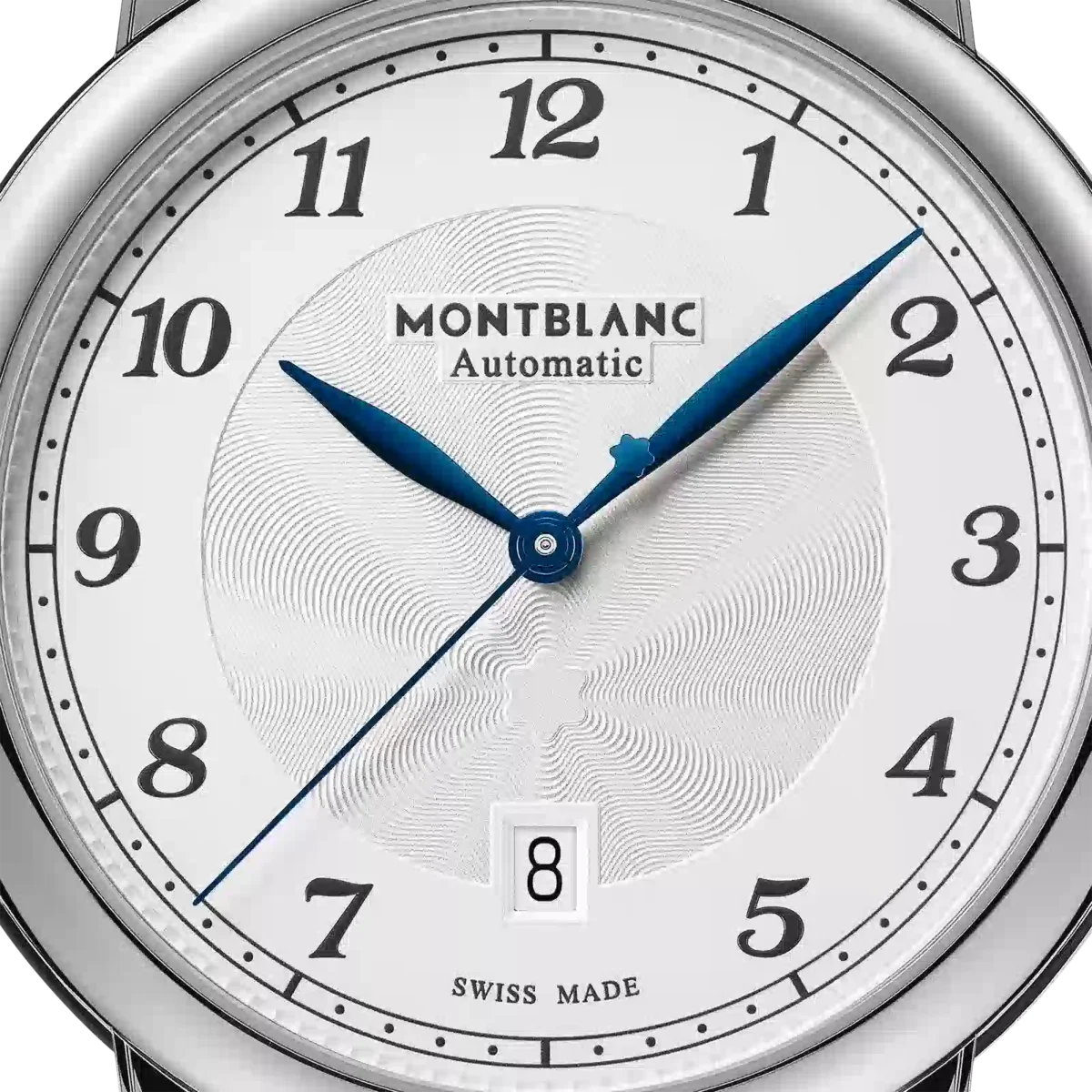 La colección Montblanc Star Legacy se inspira en la herencia de Minerva y en los relojes de bolsillo de la empresa fabricados a finales del siglo XIX y principios del XX. En consonancia con los códigos de diseño de la línea de productos, el Montblanc Star Legacy Automatic Date presenta una refinada esfera blanco plateada con el patrón guilloché de estrella explosiva de Montblanc, números arábigos, agujas en forma de hoja, un motivo guilloché «filet sauté» y una vía de tren. El reloj está equipado con el calibre automático MB 24.17 y cuenta con las horas, los minutos y los segundos en el centro y la fecha en una ventanilla a las seis en punto. Viene en una caja de acero inoxidable de 42 mm y está equipado con un brazalete de acero inoxidable.