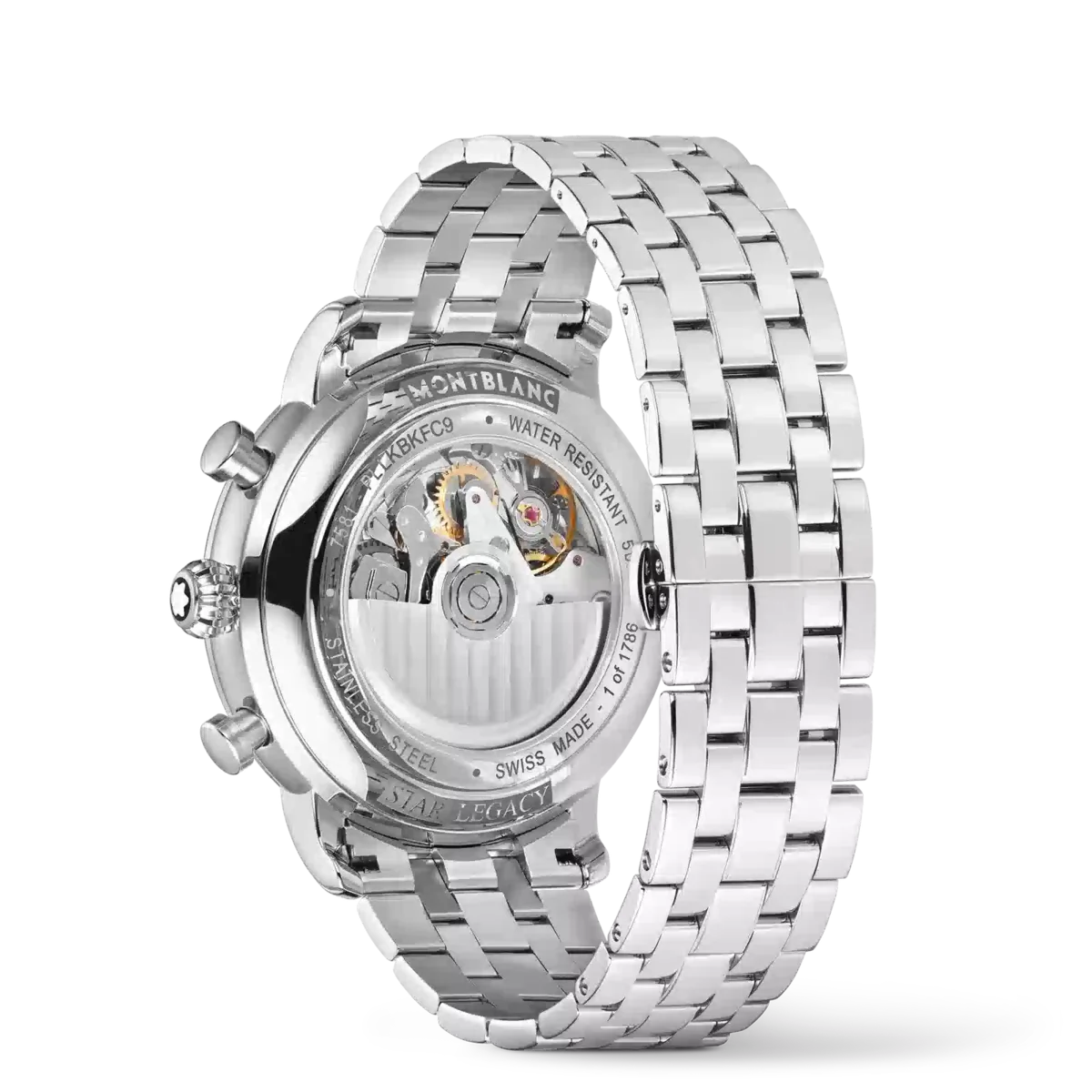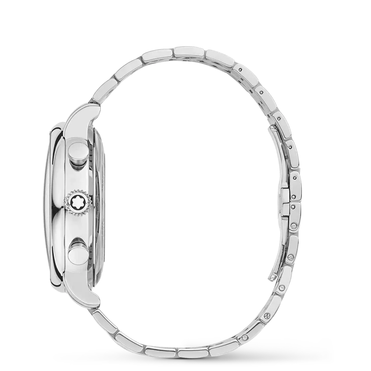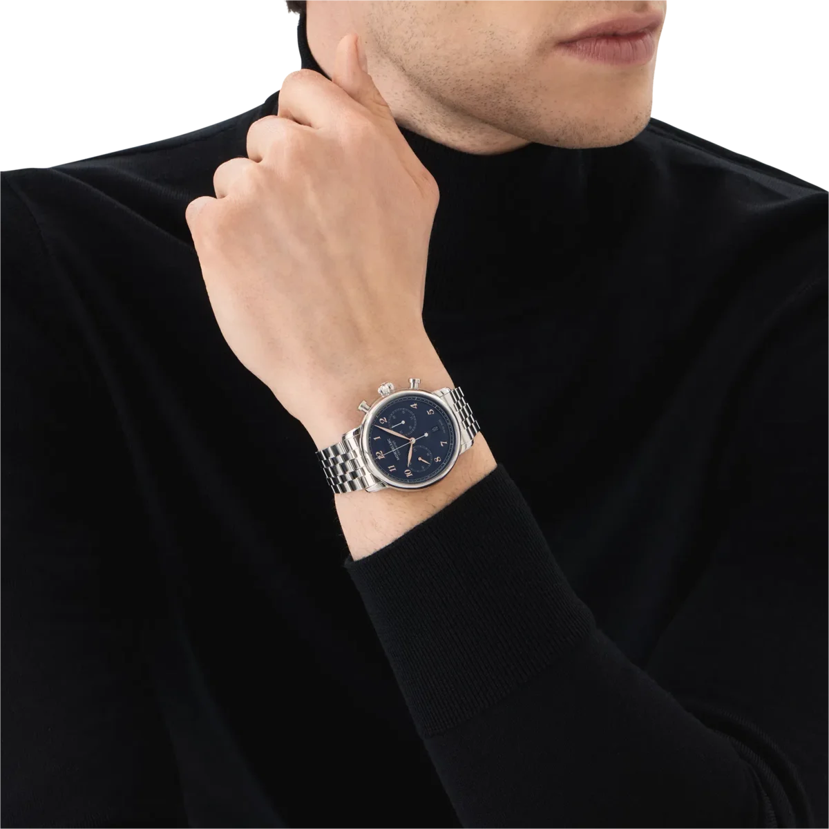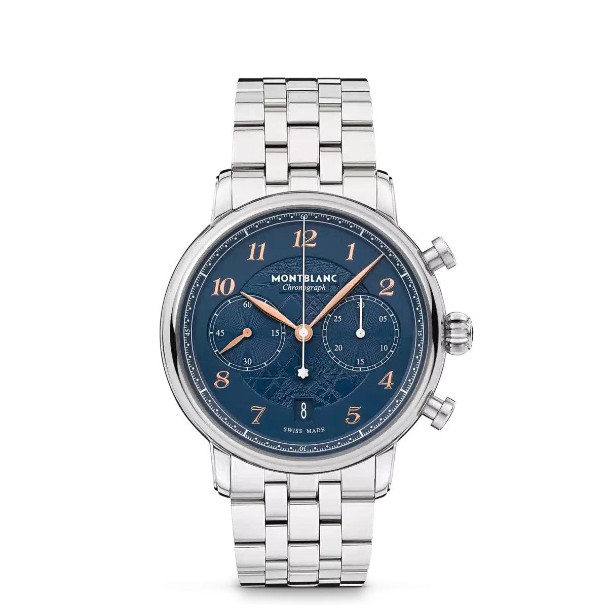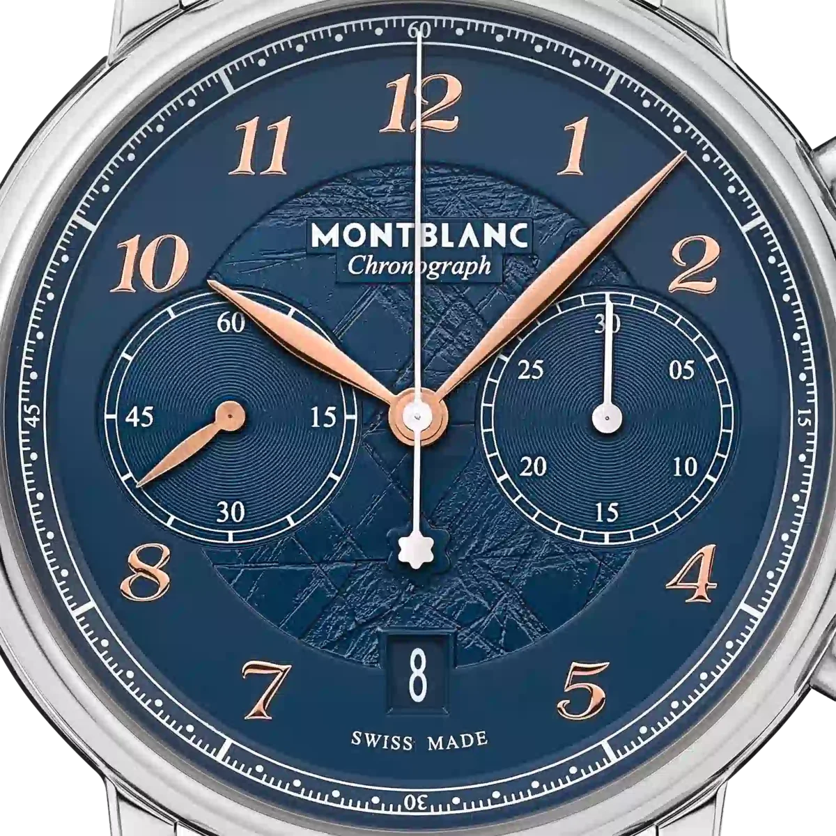 El Montblanc Star Legacy Chronograph está limitado a 1786 piezas y viene en una caja de acero inoxidable de 42 mm con forma de guijarro, números arábigos recubiertos de oro rosa y una llamativa esfera azul con diseño de glaciar. La esfera está decorada con un diseño de capas de hielo inspirado en el Mer de Glace, el glaciar principal del monte Blanc. El centro de la esfera se ha creado utilizando un sello especial que reproduce la textura del glaciar y celebra la «hora azul» (l’heure bleue), durante la cual un tono azul intenso se posa sobre el glaciar al atardecer, cuando sale la luna y comienzan a brillar las estrellas. Fue a esta hora del día cuando Jacques Balmat se convirtió en la primera persona en alcanzar la cima del Mont Blanc, a las 18:23 del 7 de agosto de 1786. Las funciones incluyen horas, minutos, segundos centrales con el emblema de Montblanc en el contrapeso, cronógrafo y fecha, y están impulsadas por el movimiento automático MB 25.13, que se puede admirar a través del fondo de la caja de cristal de zafiro. Las funciones horarias se muestran con agujas en forma de hoja recubiertas de oro rosa, mientras que las indicaciones del cronógrafo utilizan agujas «baton» recubiertas de rodio. El reloj se combina con un brazalete de acero inoxidable.