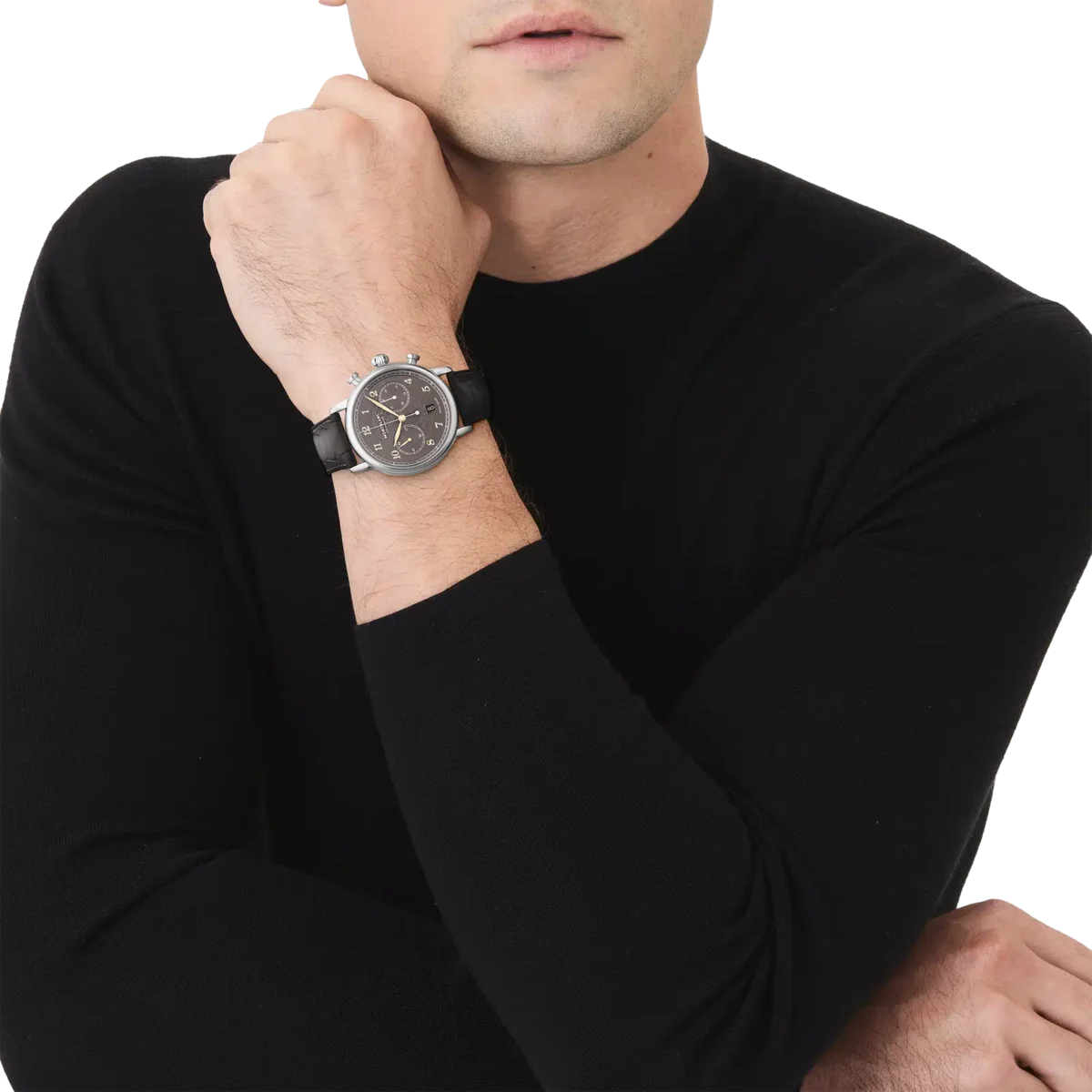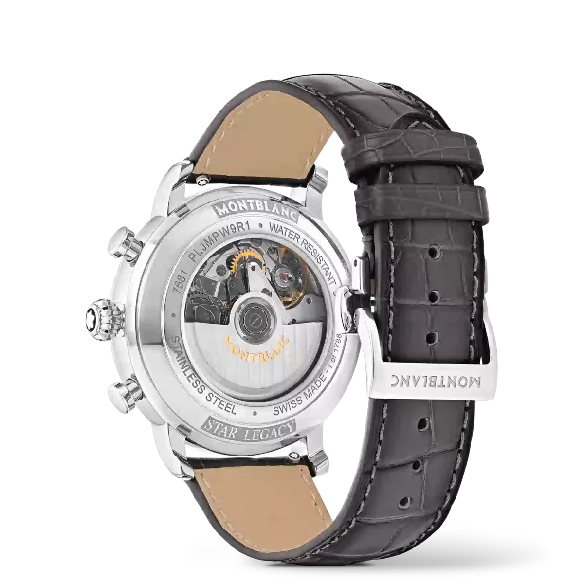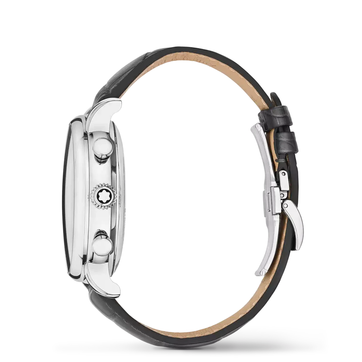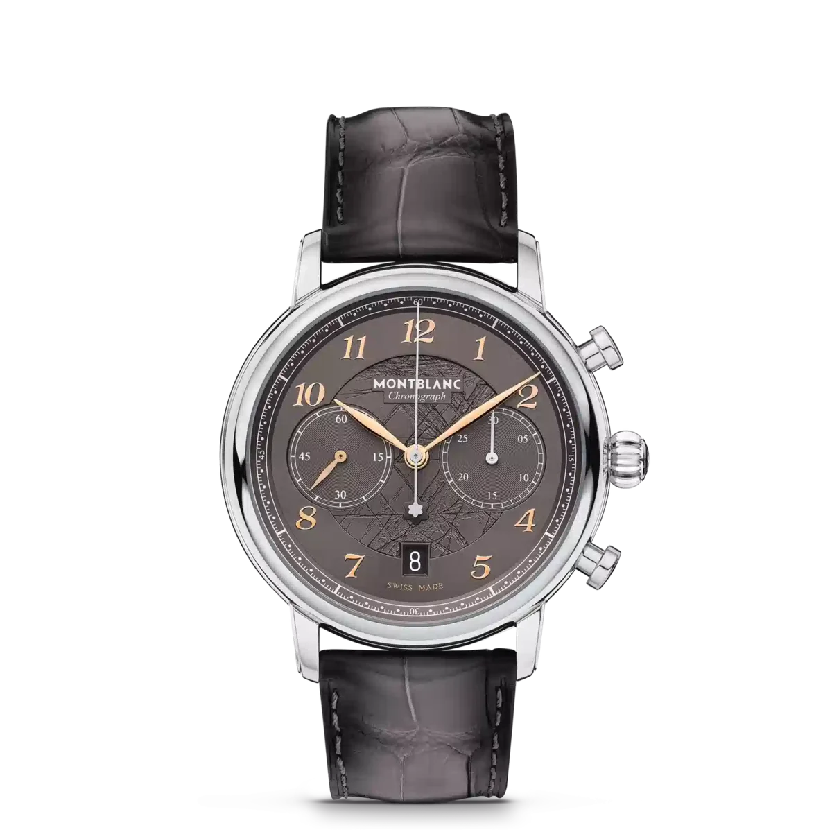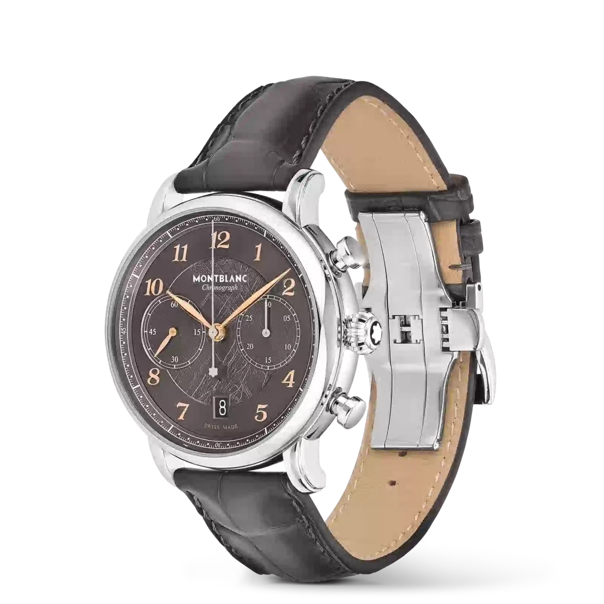 El Montblanc Star Legacy Chronograph Limited Edition, con una tirada de 1786 piezas, presenta una caja de acero inoxidable de 42 mm que destaca una nueva faceta del Mont Blanc: su lado rocoso orientado al sur. Este reloj cuenta con dos contadores de cronógrafo a las tres y las nueve en punto, lo que le confiere un aspecto elegante y una gran legibilidad. El patrón gris glaciar se percibe en el fondo, mientras que el filete sauté ha sido sustituido por un reborde interior para aportar volumen a la esfera. Las funciones horarias se muestran con agujas recubiertas de oro rosa en forma de hoja, mientras que las indicaciones del cronógrafo utilizan agujas «baton» recubiertas de rodio. El reloj viene con una correa intercambiable de piel de becerro gris con estampado de cocodrilo. N.º de identificación: MB130960 Ancho de la asa: 21 mm
