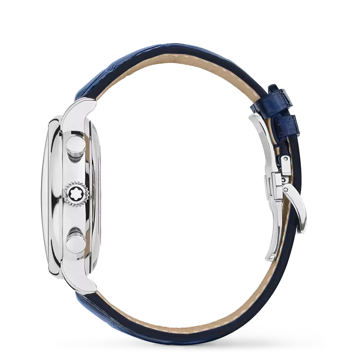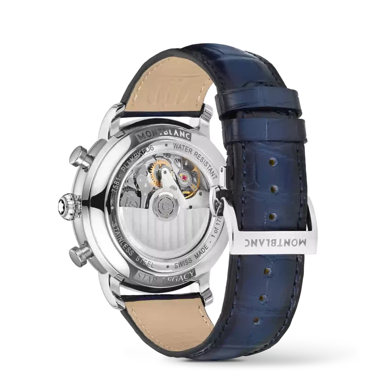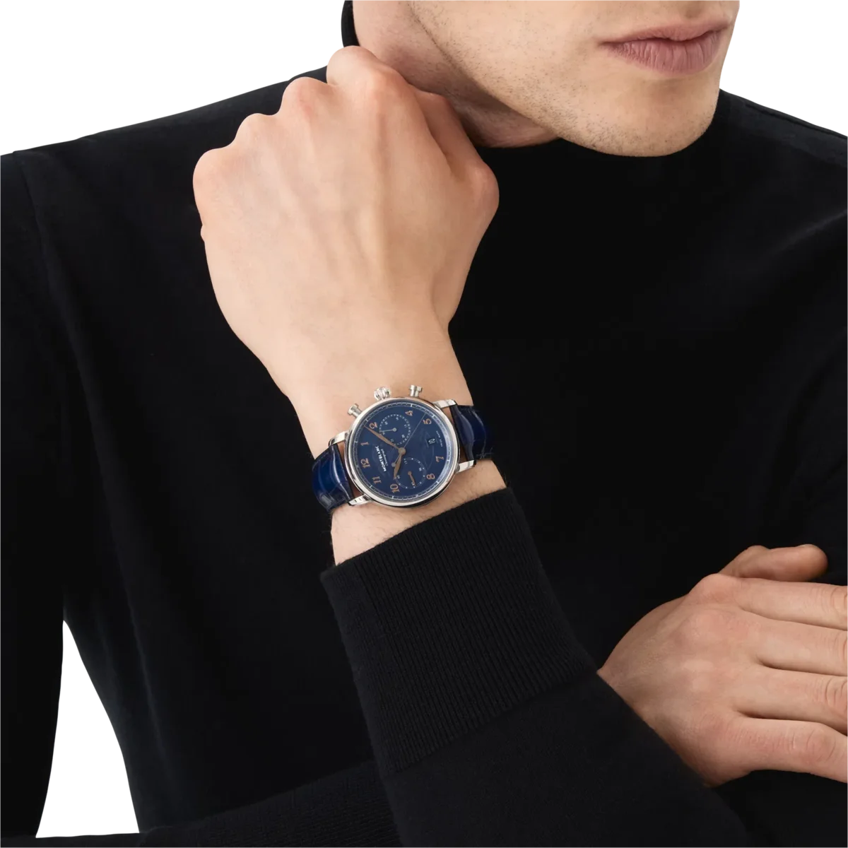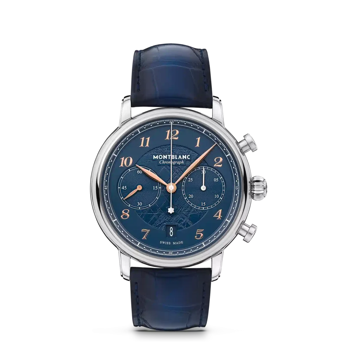 El Montblanc Star Legacy Chronograph está limitado a 1786 piezas y viene en una caja de acero inoxidable con forma de guijarro de 42 mm con números arábigos recubiertos de oro rosa y una llamativa esfera azul con patrón de glaciar. La esfera está decorada con un diseño de capas de hielo inspirado en el Mer de Glace, el glaciar principal del monte Blanc. El centro de la esfera se ha creado utilizando un sello especial que reproduce la textura de este glaciar y celebra la «hora azul» (l’heure bleue), durante la cual un tono de azul intenso cae sobre el glaciar al atardecer, cuando sale la luna y comienzan a brillar las estrellas. Fue a esta hora del día cuando Jacques Balmat se convirtió en la primera persona en alcanzar la cima del Mont Blanc, a las 18:23 del 7 de agosto de 1786. Las funciones incluyen horas, minutos, segundos centrales con el emblema de Montblanc en el contrapeso, cronógrafo y fecha, y están impulsadas por el movimiento automático MB 25.13, que se puede admirar a través del fondo de la caja de cristal de zafiro. Las funciones horarias se muestran con agujas en forma de hoja recubiertas de oro rosa, mientras que las indicaciones del cronógrafo utilizan agujas «baton» recubiertas de rodio. El reloj se combina con una correa de cocodrilo azul sfumato. N.º de identificación: MB129626. Ancho de la asa: 21 mm.