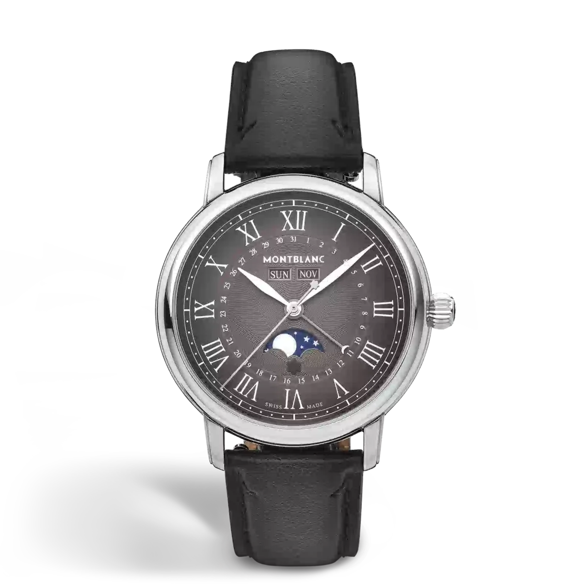 El Montblanc Star Legacy Full Calendar lleva los mejores códigos de diseño de la Maison a un nuevo nivel de elegancia. El reloj presenta una esfera antracita sfumato con motivo guilloché de estrellas explosivas, un filete sauté, números romanos recubiertos de rodio, agujas en forma de hoja e indica las horas, los minutos y los segundos, así como el día, la fecha, el mes y la fase lunar de una manera sencilla y elegante. Este modelo está impulsado por el movimiento automático MB 24.30 y se aloja en una caja de acero inoxidable de 42 mm con forma de guijarro, provista de un fondo abierto que permite ver la masa oscilante decorada con el emblema de Montblanc. La correa intercambiable de piel de becerro antracita ha sido especialmente diseñada por el director artístico de Montblanc, Marco Tomasetta, quien se inspiró en las plumillas de los instrumentos de escritura de la Maison por su forma puntiaguda, realzada con un efecto sfumato vertical.