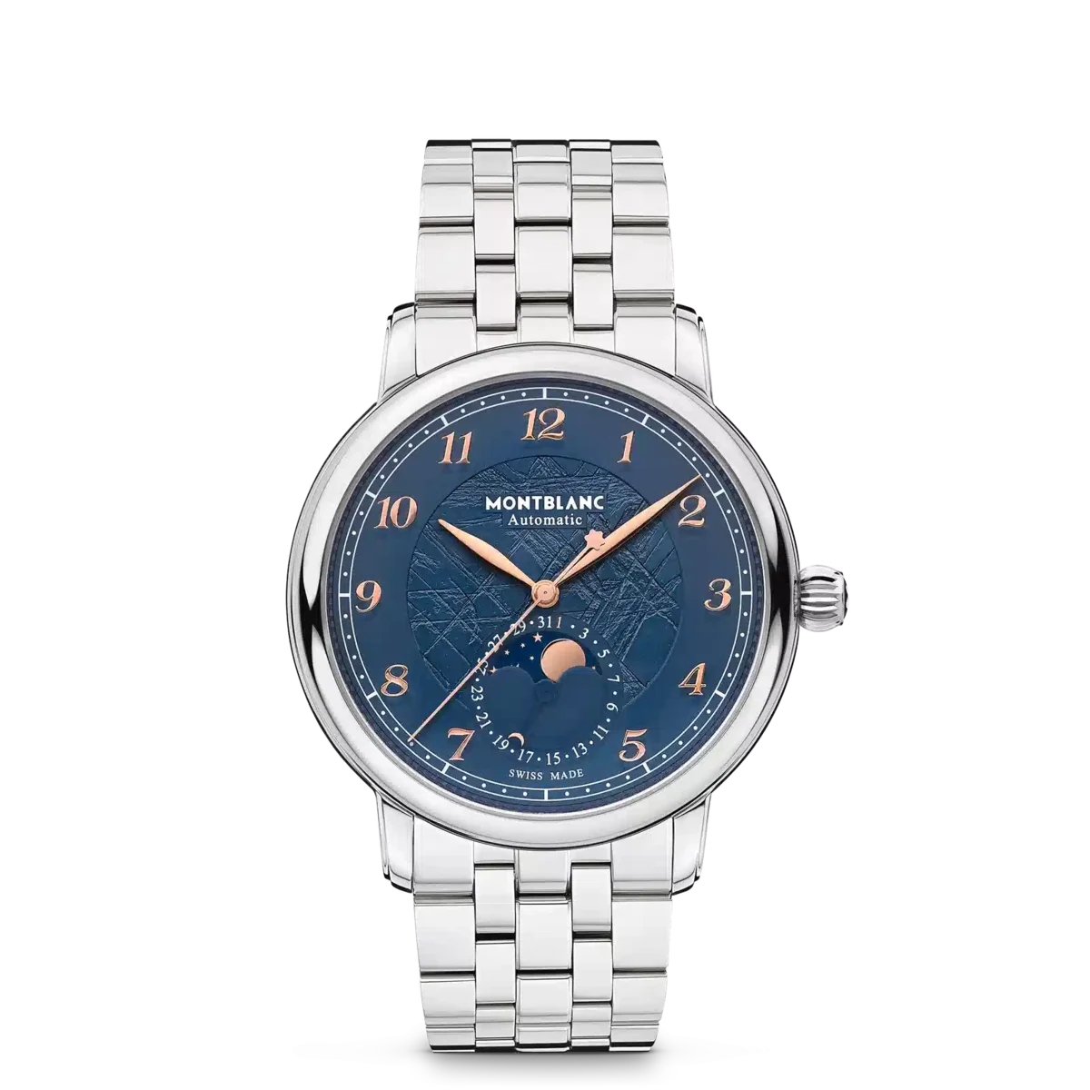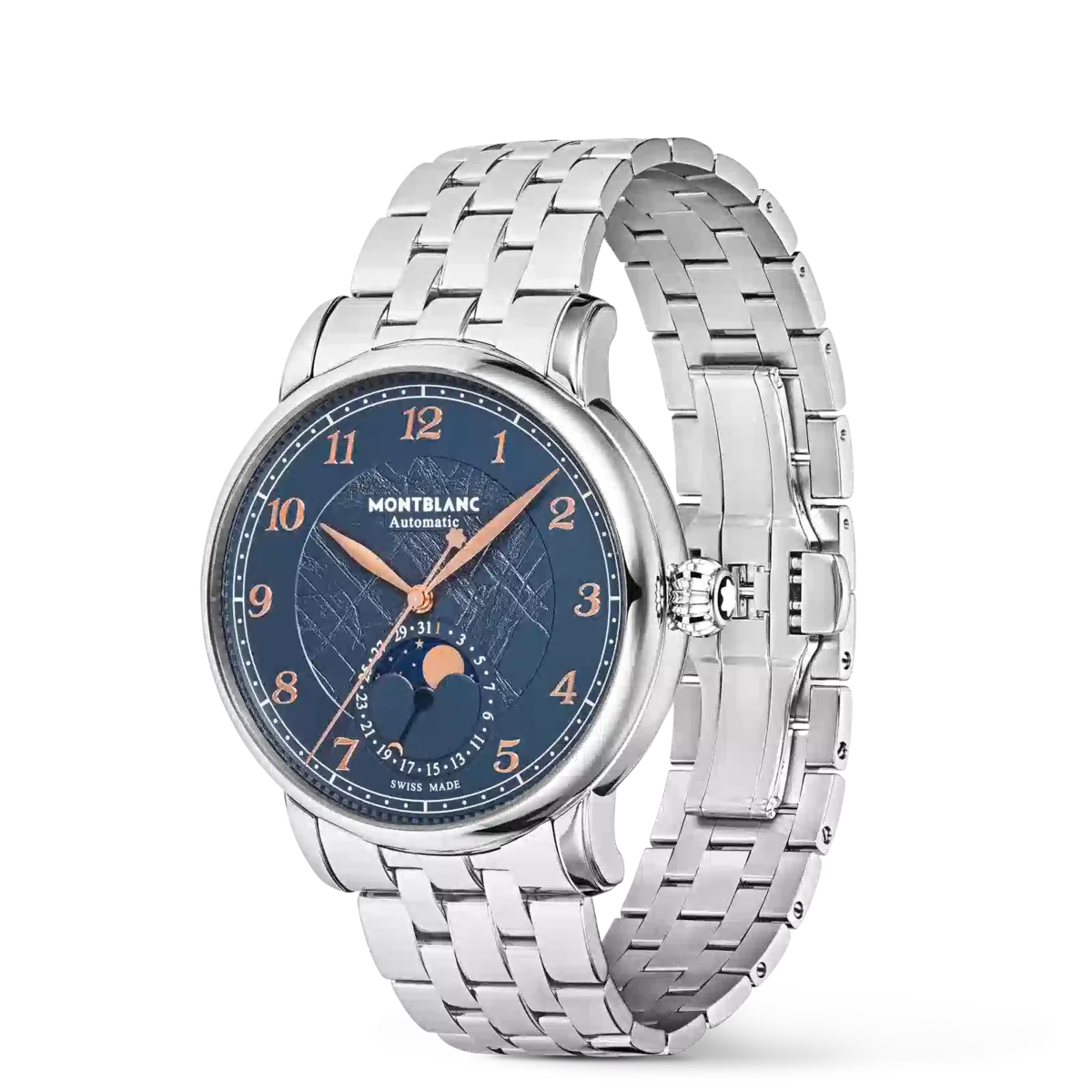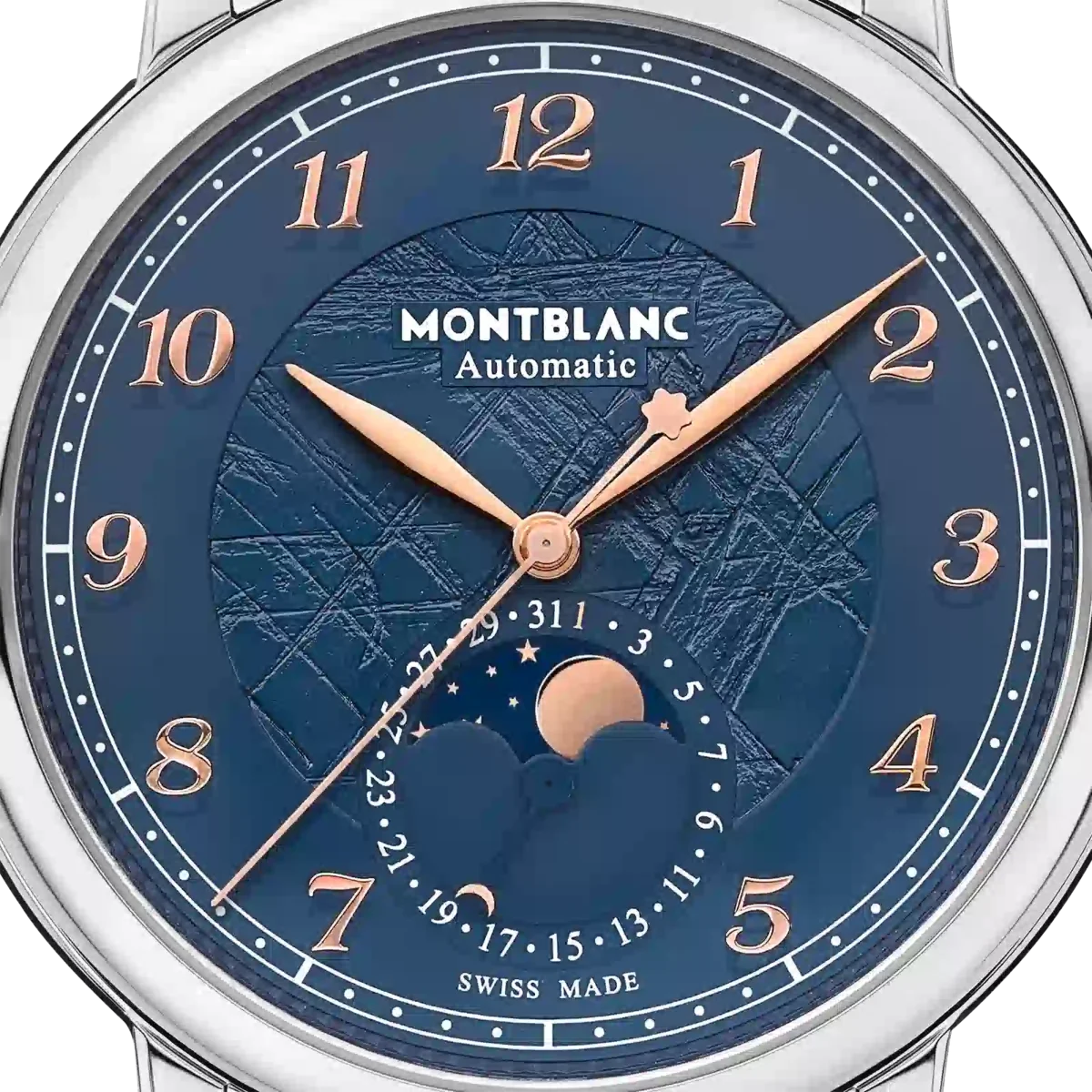 El Montblanc Star Legacy Moonphase está limitado a 1786 piezas y viene en una caja de acero inoxidable de 42 mm con forma de guijarro, agujas recubiertas de oro rosa, números arábigos y una llamativa esfera con diseño de glaciar azul. La esfera está decorada con un diseño de capas de hielo inspirado en el Mer de Glace, el glaciar principal del monte Blanc. El centro de la esfera se ha creado utilizando un sello especial que reproduce la textura del glaciar y celebra la «hora azul» (l’heure bleue), durante la cual un tono azul intenso se posa sobre el glaciar al atardecer, cuando sale la luna y comienzan a brillar las estrellas. Fue a esta hora del día cuando Jacques Balmat se convirtió en la primera persona en alcanzar la cima del Mont Blanc, a las 18:23 del 7 de agosto de 1786. Las funciones incluyen horas, minutos, segundos centrales con el emblema de Montblanc en el contrapeso, fase lunar y fecha, y están impulsadas por el movimiento automático MB 24.31, que se puede admirar a través del fondo de cristal de zafiro. El reloj se combina con un brazalete de acero inoxidable. N.º de identificación: MB129631