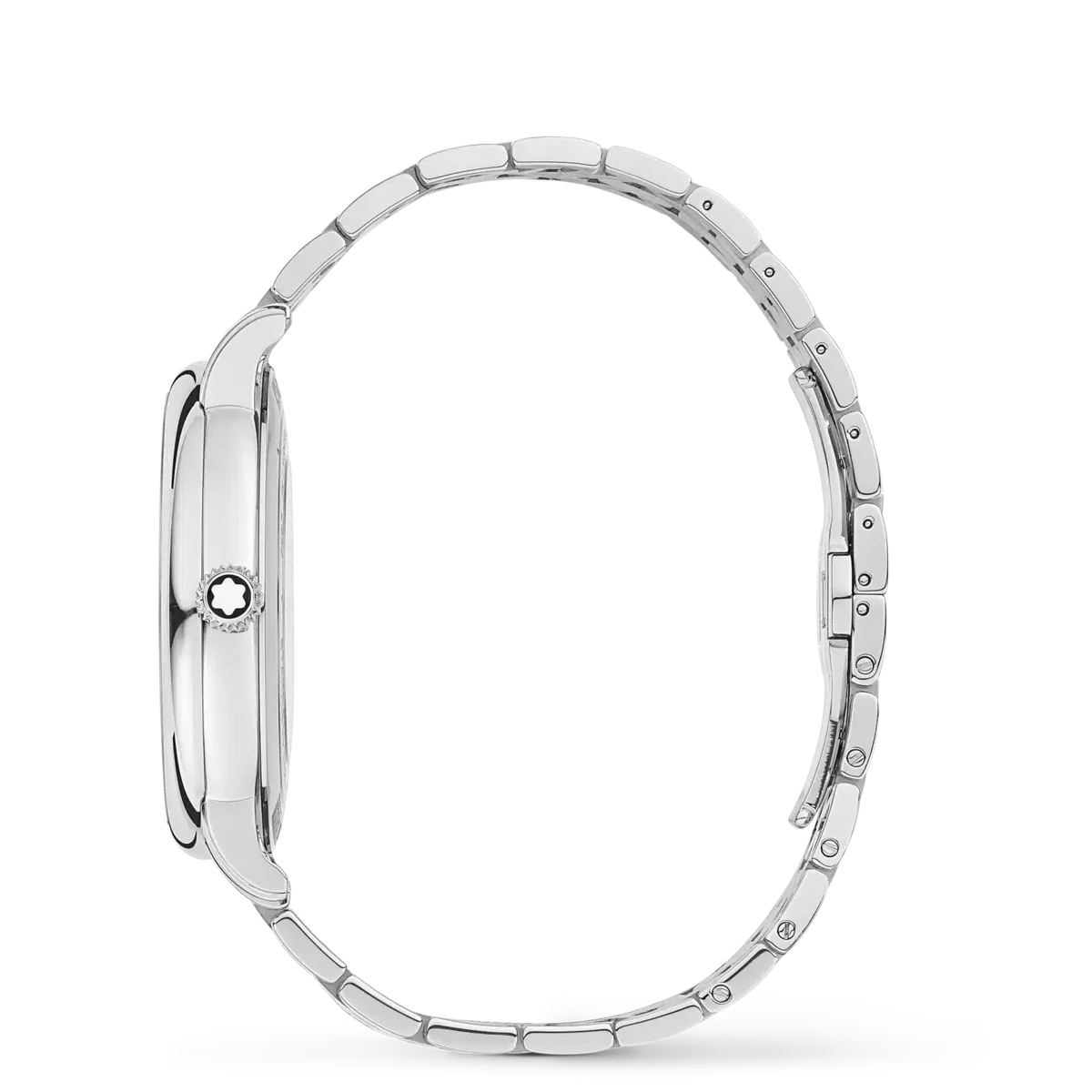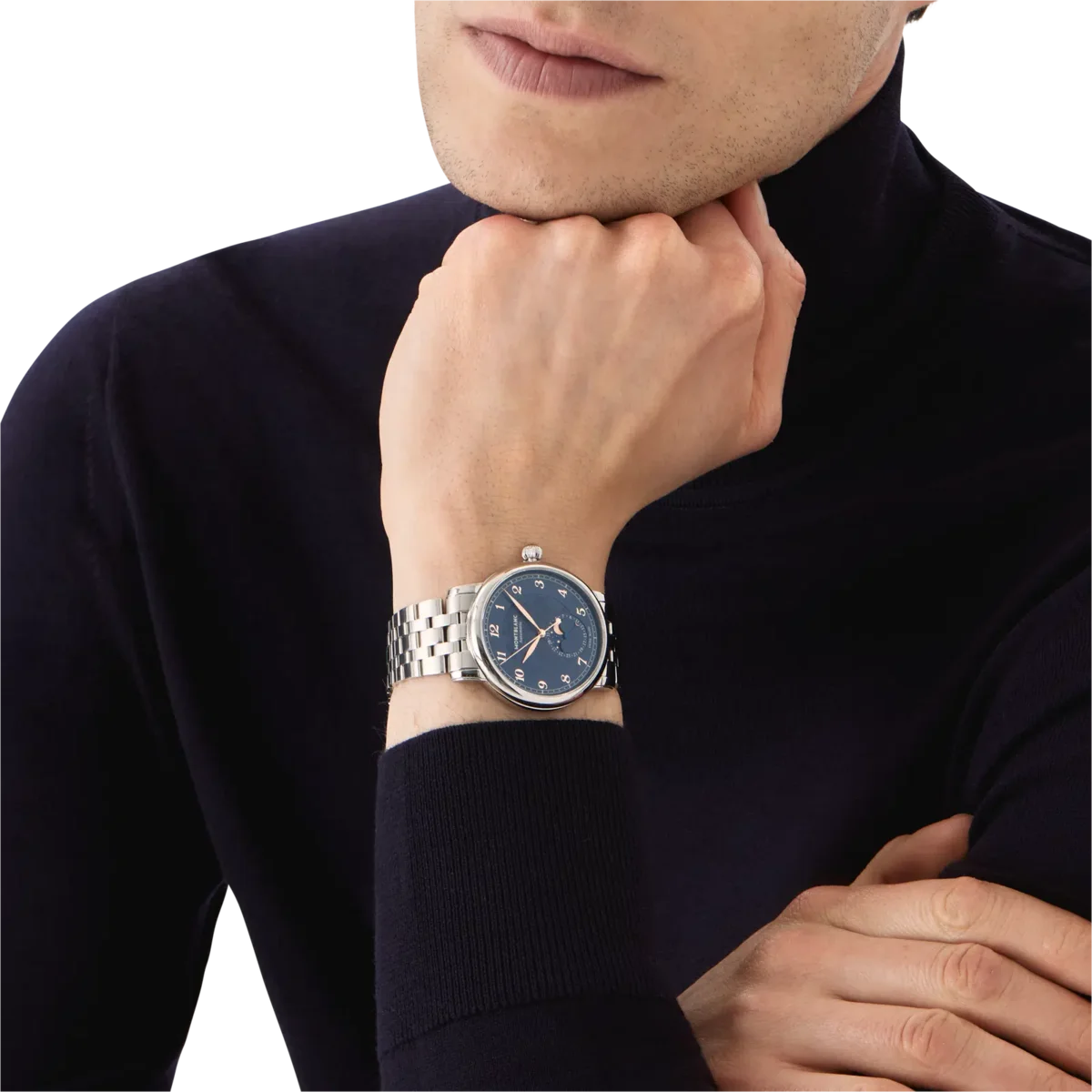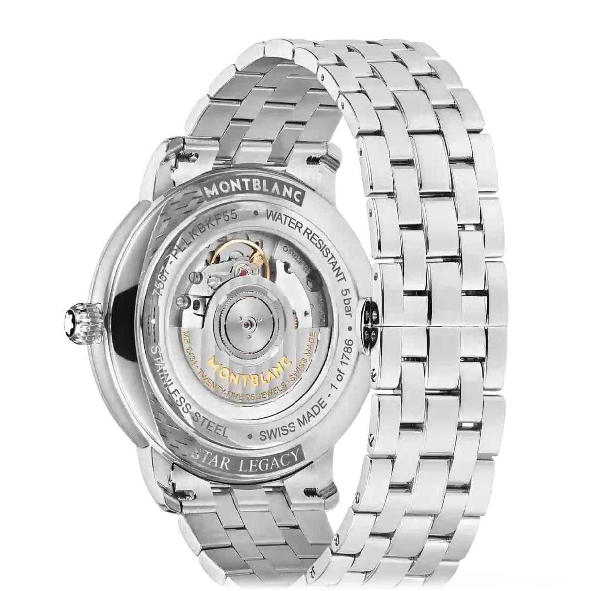 El Montblanc Star Legacy Moonphase está limitado a 1786 piezas y viene en una caja de acero inoxidable de 42 mm con forma de guijarro, agujas recubiertas de oro rosa, números arábigos y una llamativa esfera con diseño de glaciar azul. La esfera está decorada con un diseño de capas de hielo inspirado en el Mer de Glace, el glaciar principal del monte Blanc. El centro de la esfera se ha creado utilizando un sello especial que reproduce la textura del glaciar y celebra la «hora azul» (l’heure bleue), durante la cual un tono azul intenso se posa sobre el glaciar al atardecer, cuando sale la luna y comienzan a brillar las estrellas. Fue a esta hora del día cuando Jacques Balmat se convirtió en la primera persona en alcanzar la cima del Mont Blanc, a las 18:23 del 7 de agosto de 1786. Las funciones incluyen horas, minutos, segundos centrales con el emblema de Montblanc en el contrapeso, fase lunar y fecha, y están impulsadas por el movimiento automático MB 24.31, que se puede admirar a través del fondo de cristal de zafiro. El reloj se combina con un brazalete de acero inoxidable. N.º de identificación: MB129631