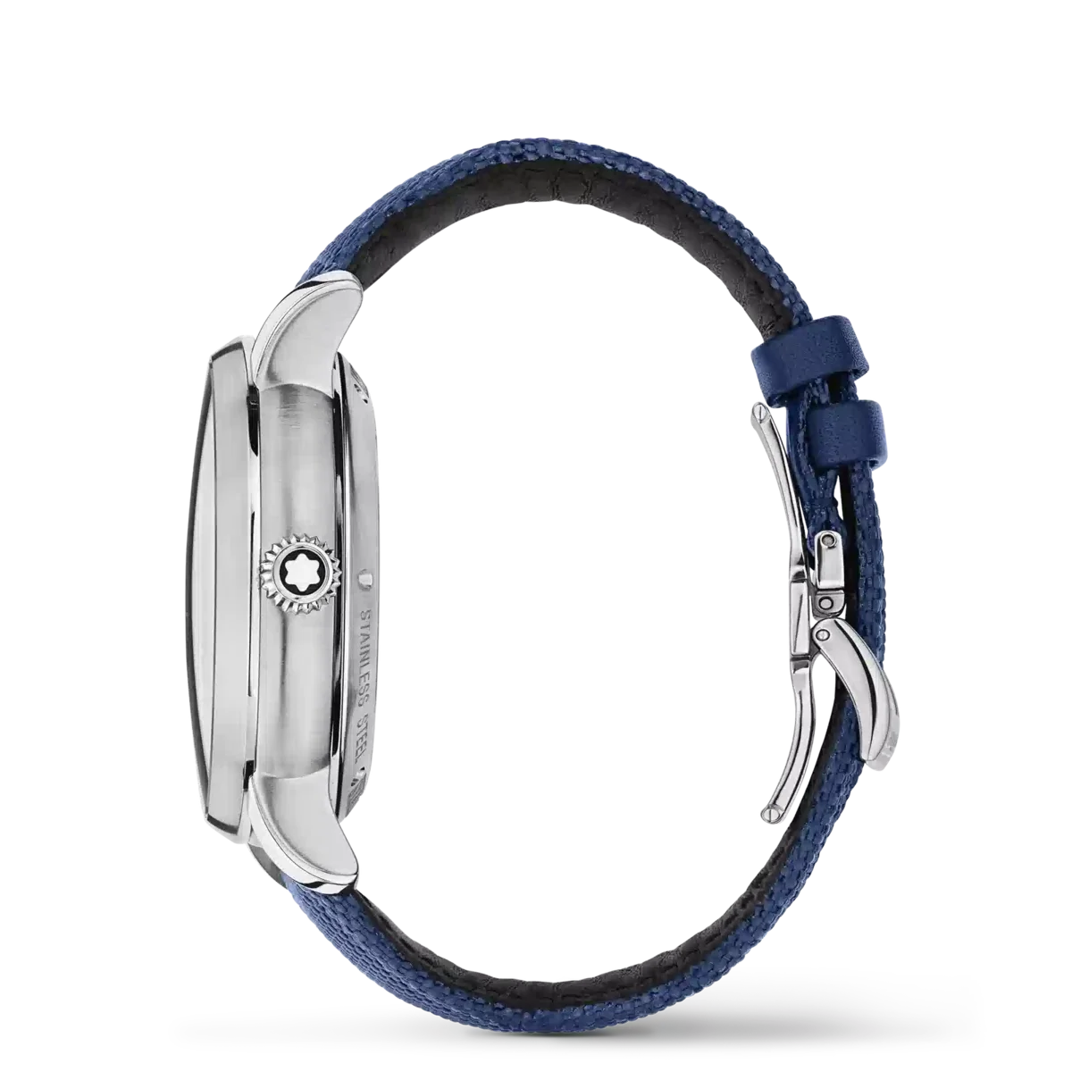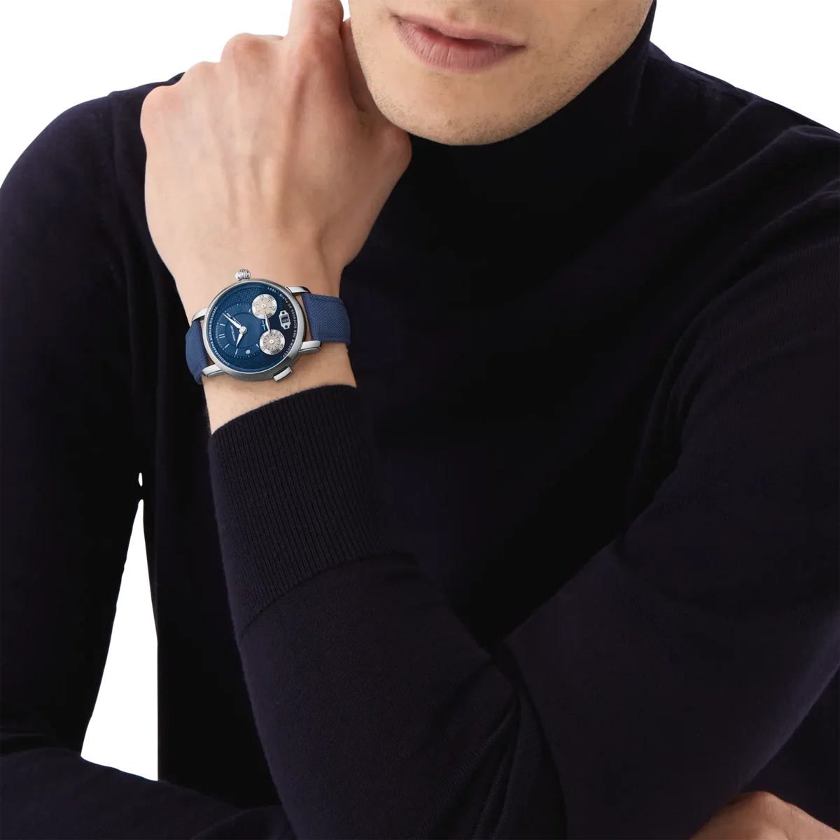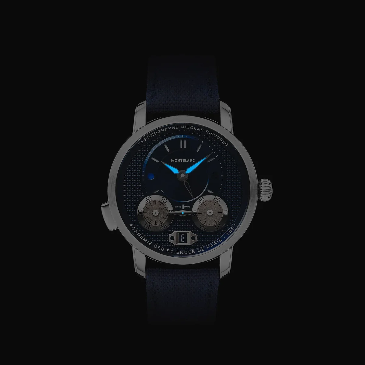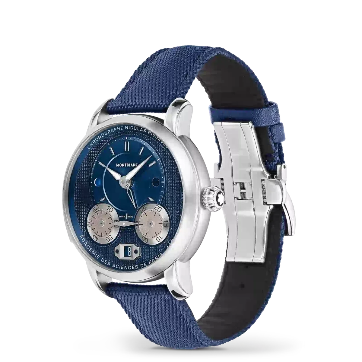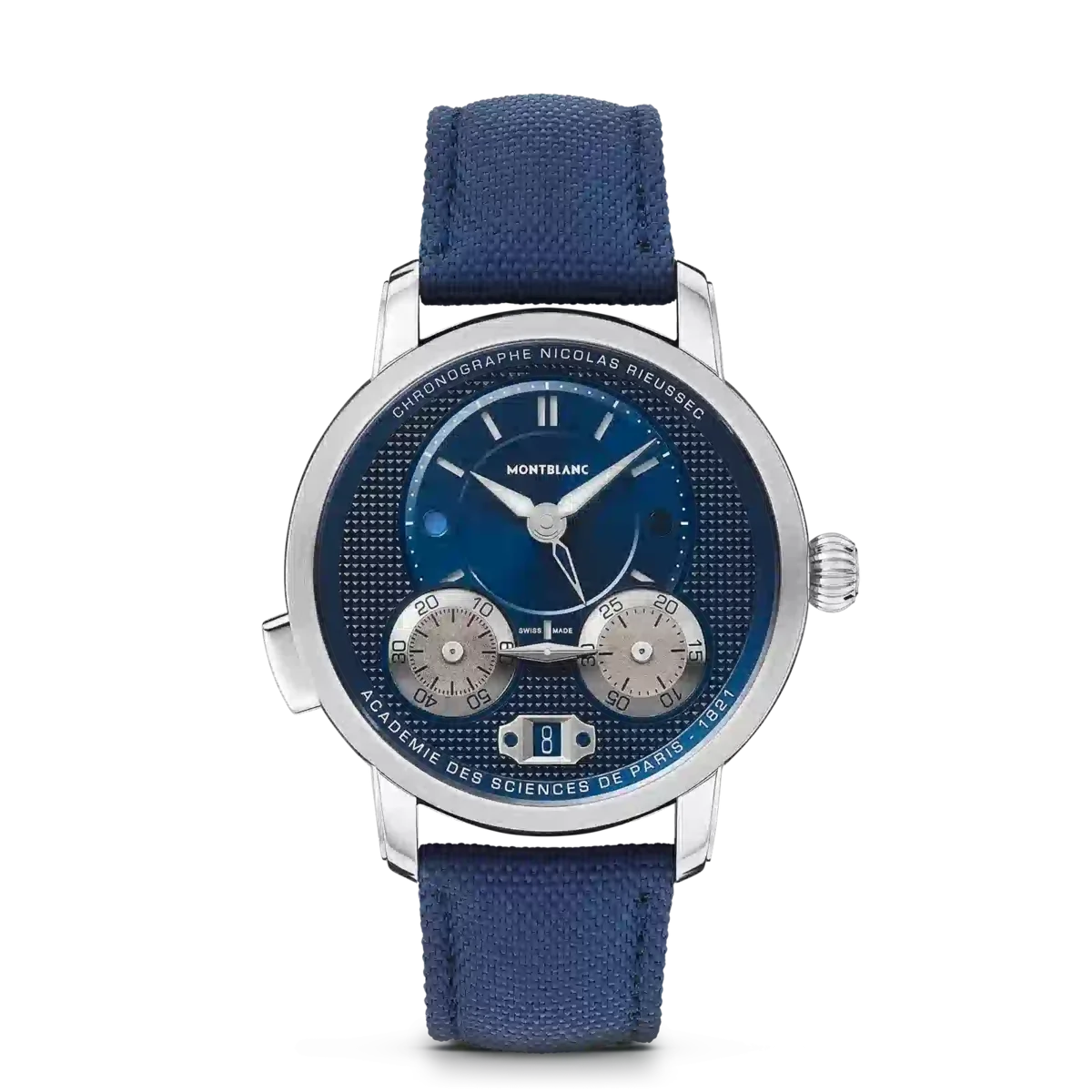 El Montblanc Star Legacy Nicolas Rieussec Monopusher Chronograph funciona con el movimiento de fabricación MB R200 y presenta una caja de acero inoxidable de 43 mm con esfera azul, agujas recubiertas de rodio e índices de color blanco plateado. Este nuevo modelo presenta varios detalles que refuerzan la conexión histórica con París, donde comenzó la historia del cronógrafo Montblanc en el hipódromo Champ-de-Mars, incluido un motivo Clou de Paris en la esfera que se prolonga hasta la masa oscilante y la correa textil. Este motivo tiene su origen en el diseño geométrico de las calles empedradas de París y es el nexo entre el pasado y el futuro de este reloj.