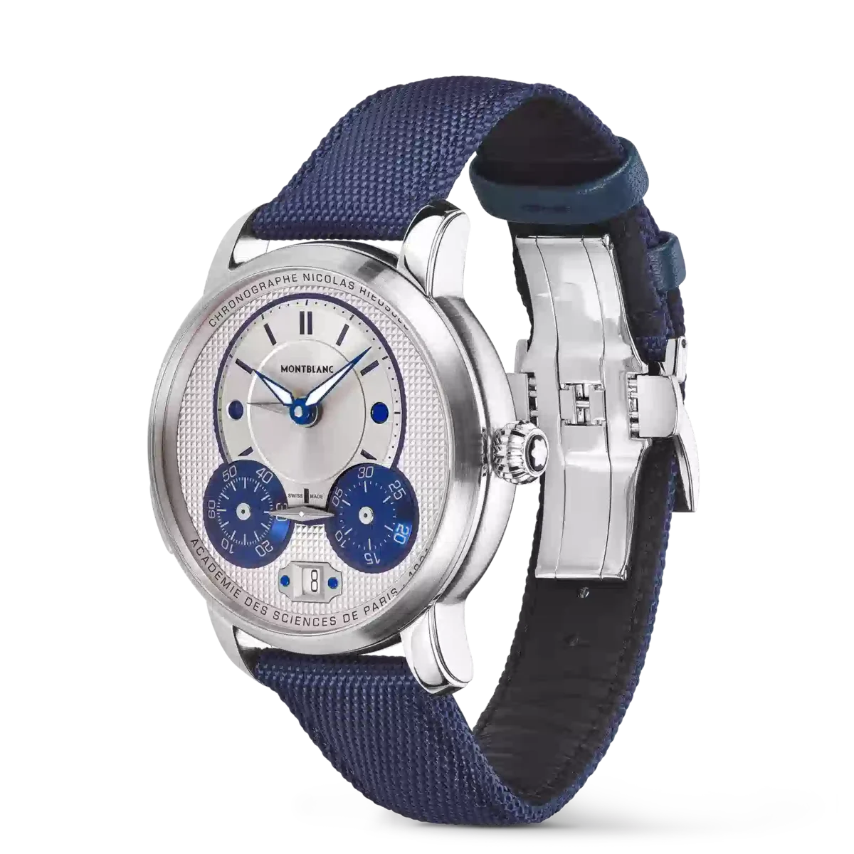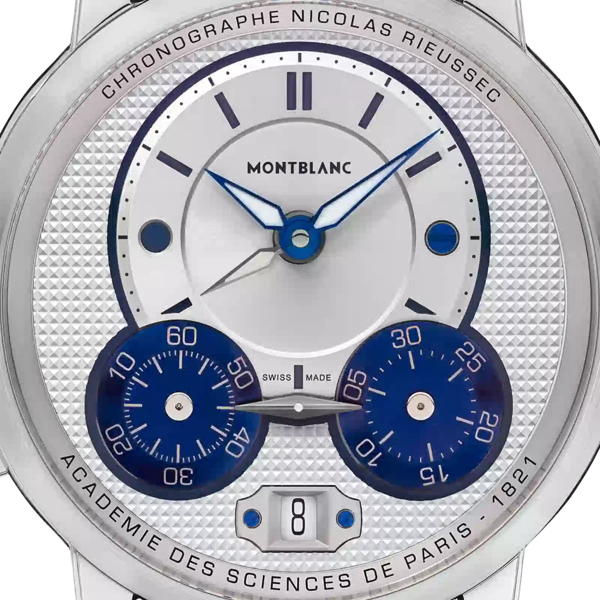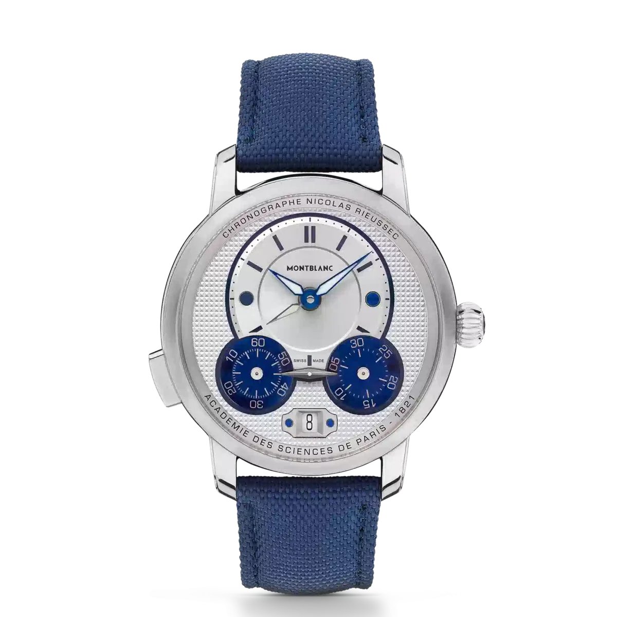 El Montblanc Star Legacy Nicolas Rieussec Chronograph 43 mm rinde homenaje al invento del cronógrafo de tinta, probado por primera vez por Nicolas Rieussec en 1821 en París y validado por la Académie des Sciences. Esta nueva versión presenta una caja de acero inoxidable de 43 mm con esfera gris y azul. Los motivos Clou de Paris se encuentran en la esfera, la masa oscilante y la correa textil azul, que recuerdan a las calles empedradas de París. Entre sus funciones se incluyen cronógrafo, indicador de día y noche, segunda zona horaria y fecha. El reloj está impulsado por el movimiento cronógrafo monopulsador MB R200 Montblanc Manufacture. N.º de identificación: MB129764 Ancho de la asa: 21 mm