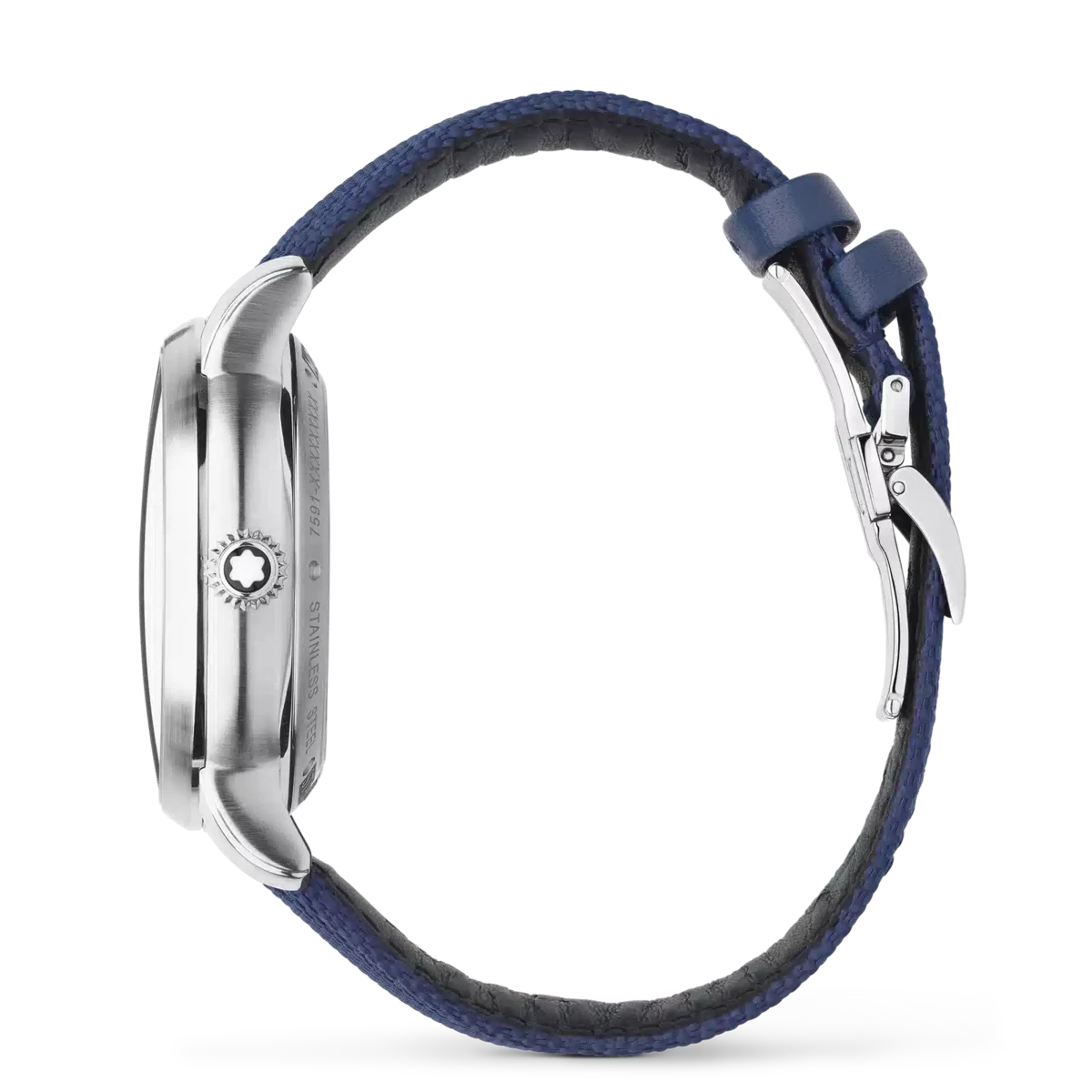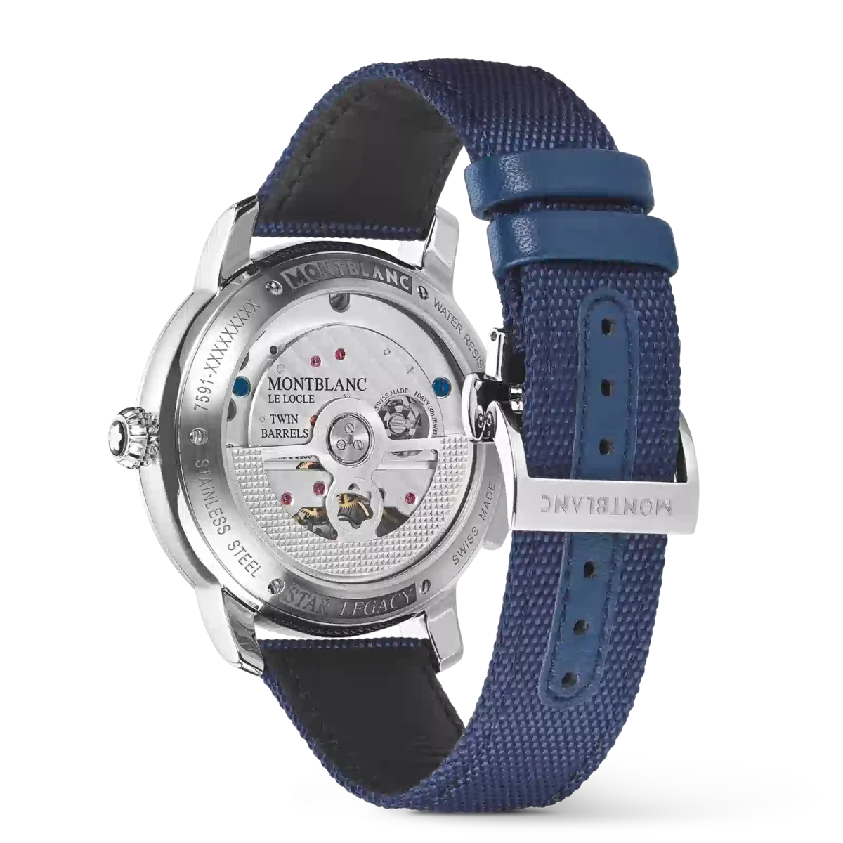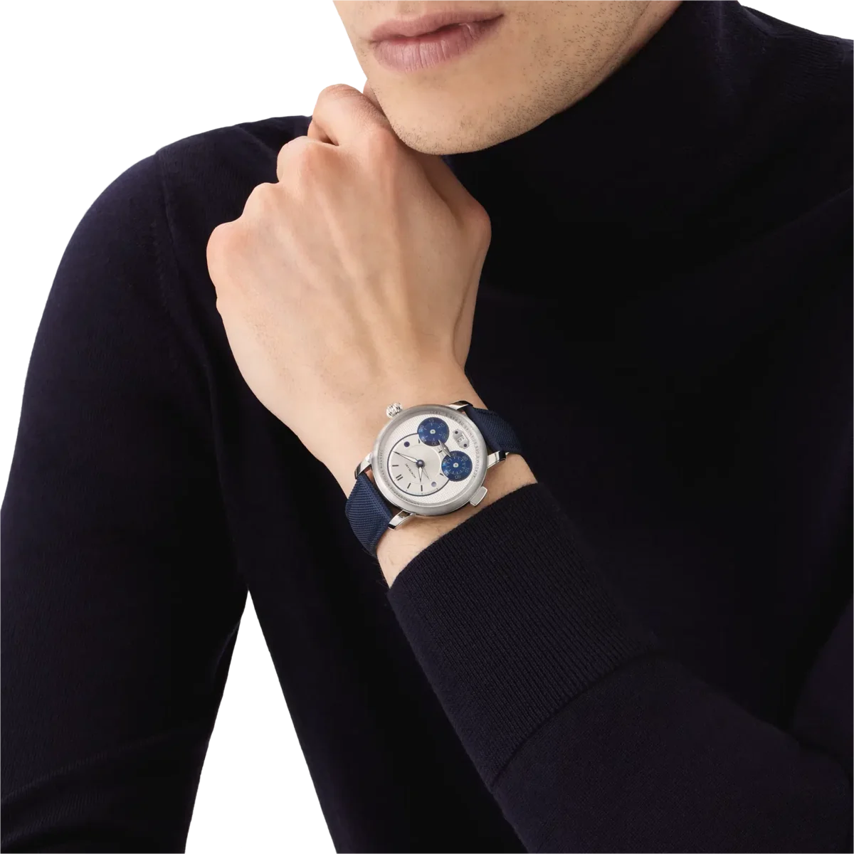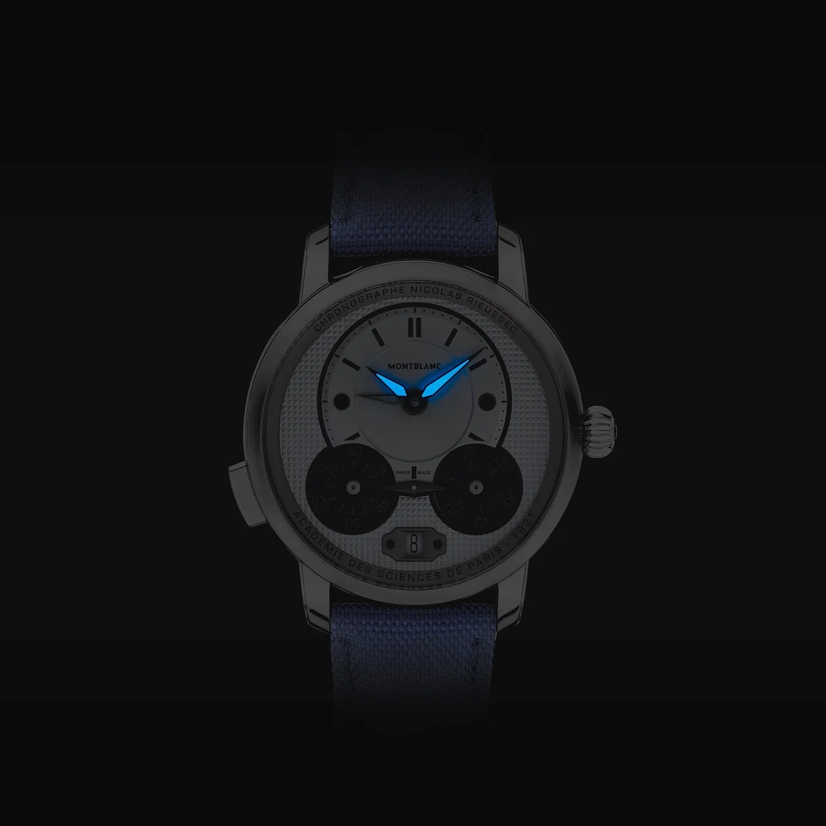 El Montblanc Star Legacy Nicolas Rieussec Chronograph 43 mm rinde homenaje al invento del cronógrafo de tinta, probado por primera vez por Nicolas Rieussec en 1821 en París y validado por la Académie des Sciences. Esta nueva versión presenta una caja de acero inoxidable de 43 mm con esfera gris y azul. Los motivos Clou de Paris se encuentran en la esfera, la masa oscilante y la correa textil azul, que recuerdan a las calles empedradas de París. Entre sus funciones se incluyen cronógrafo, indicador de día y noche, segunda zona horaria y fecha. El reloj está impulsado por el movimiento cronógrafo monopulsador MB R200 Montblanc Manufacture. N.º de identificación: MB129764 Ancho de la asa: 21 mm