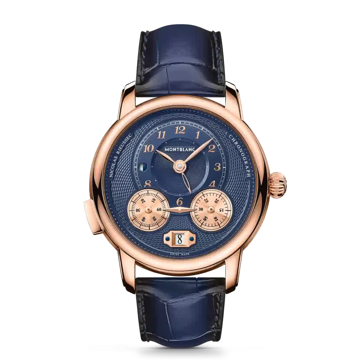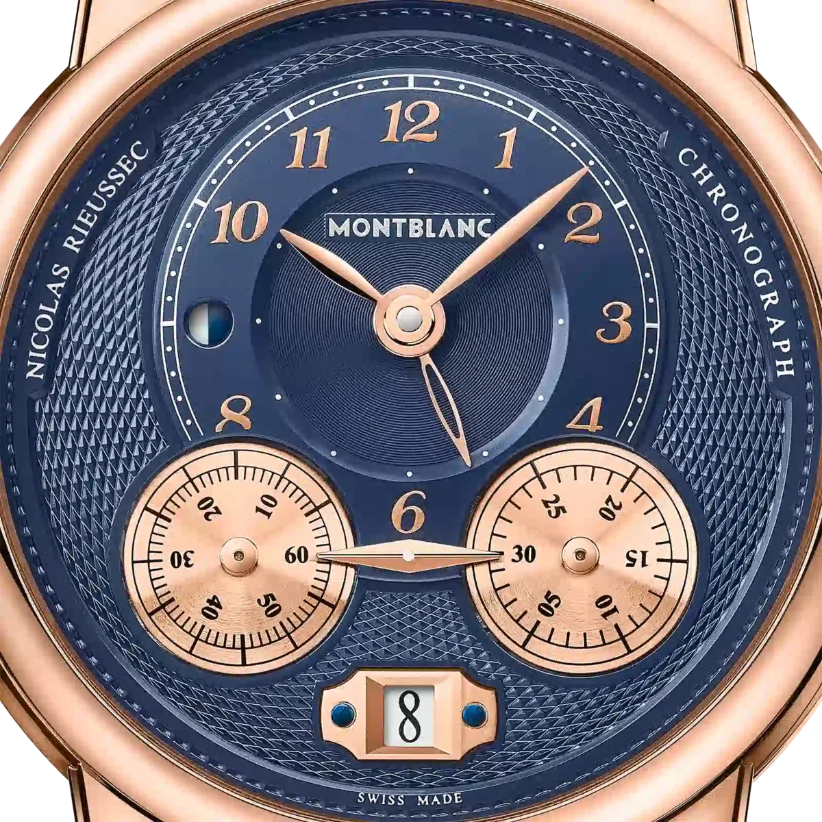 La línea de productos Montblanc Star Legacy se inspira en la herencia de Minerva y en los relojes de bolsillo de la empresa fabricados a finales del siglo XIX y principios del XX. El Montblanc Star Legacy Nicolas Rieussec Chronograph rinde homenaje al relojero francés Nicolas Rieussec, inventor del cronógrafo de tinta, patentado en 1821 y que marcó la historia de la alta relojería. El reloj incorpora dos discos giratorios muy reconocibles, alineados horizontalmente en la esfera del reloj, uno para el contador de 60 segundos del cronógrafo y otro para el contador de 30 minutos, que giran bajo un doble índice fijo, como en el dispositivo original. Tanto los contadores como el anillo descentrado de las horas y los minutos son abombados para crear un llamativo efecto tridimensional. El reloj está impulsado por el movimiento cronógrafo monopulsador de la Manufactura, calibre MB R200, con cuerda automática y un mecanismo de rueda de pilares que se puede admirar a través del fondo de cristal de zafiro. El calibre tiene dos barriletes que almacenan energía suficiente para 72 horas de reserva de marcha. El Montblanc Star Legacy Nicolas Rieussec Chronograph se presenta en una caja de oro rosa 750/1000 (18 quilates) de 44,8 mm con esfera azul y correa de piel de cocodrilo azul sfumato a juego.