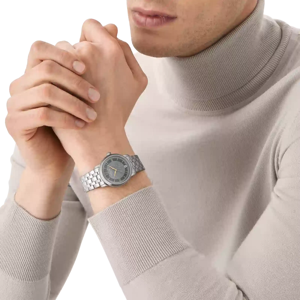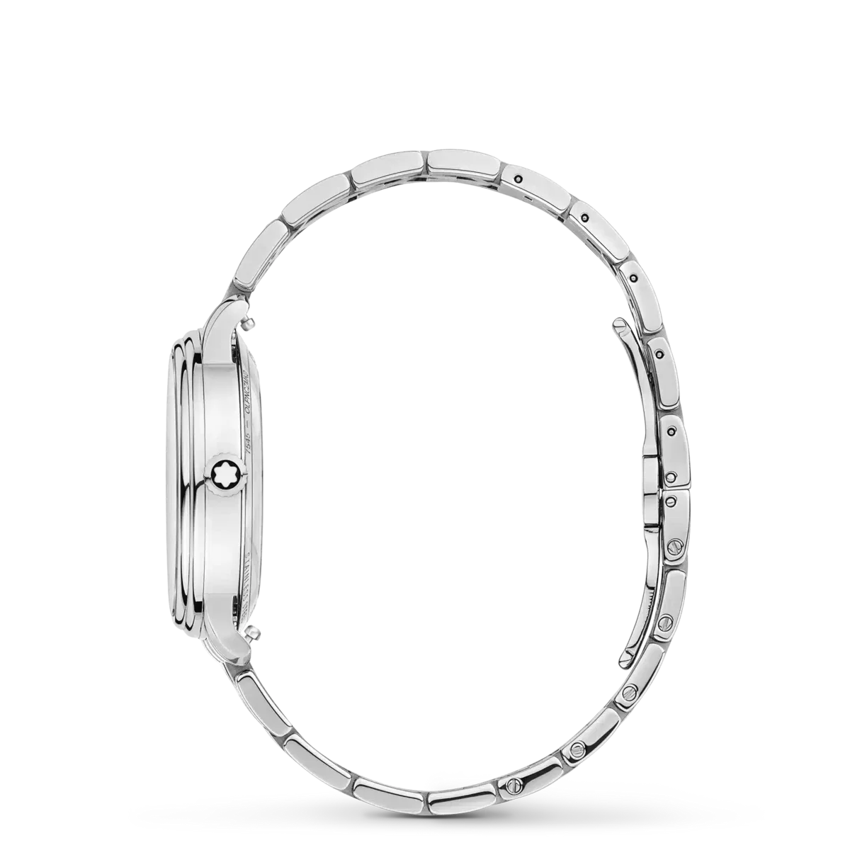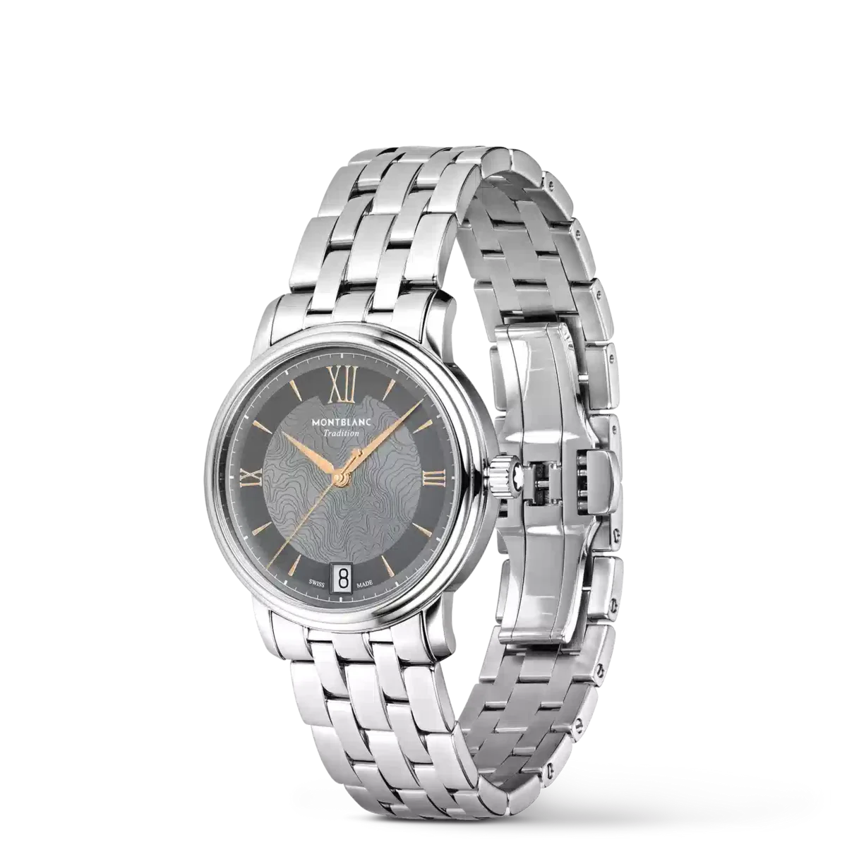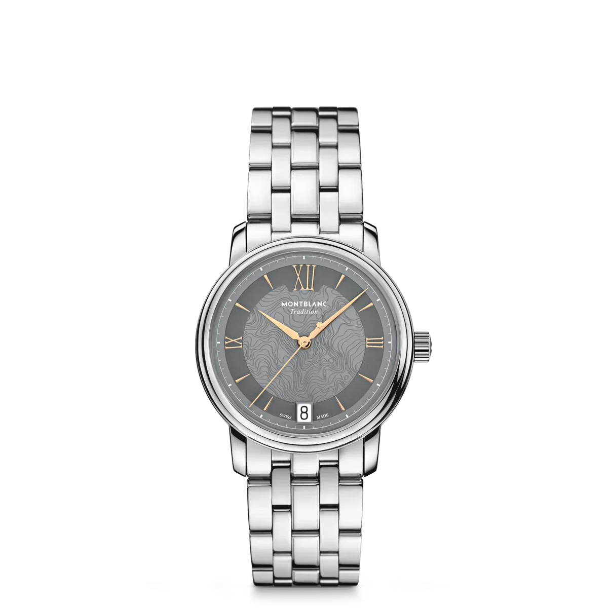 El Montblanc Tradition Automatic Date viene en una caja de acero inoxidable de 32 mm con asas rectas y bisel doble. El reloj cuenta con una esfera gris que representa la topografía del Mont Blanc con números romanos de color oro rosa y un prominente «XII» romano. Las agujas de las horas y los minutos en forma de espada, el segundero y la corona con el emblema de Montblanc, así como el brazalete intercambiable de acero inoxidable, completan su elegante aspecto contemporáneo.
