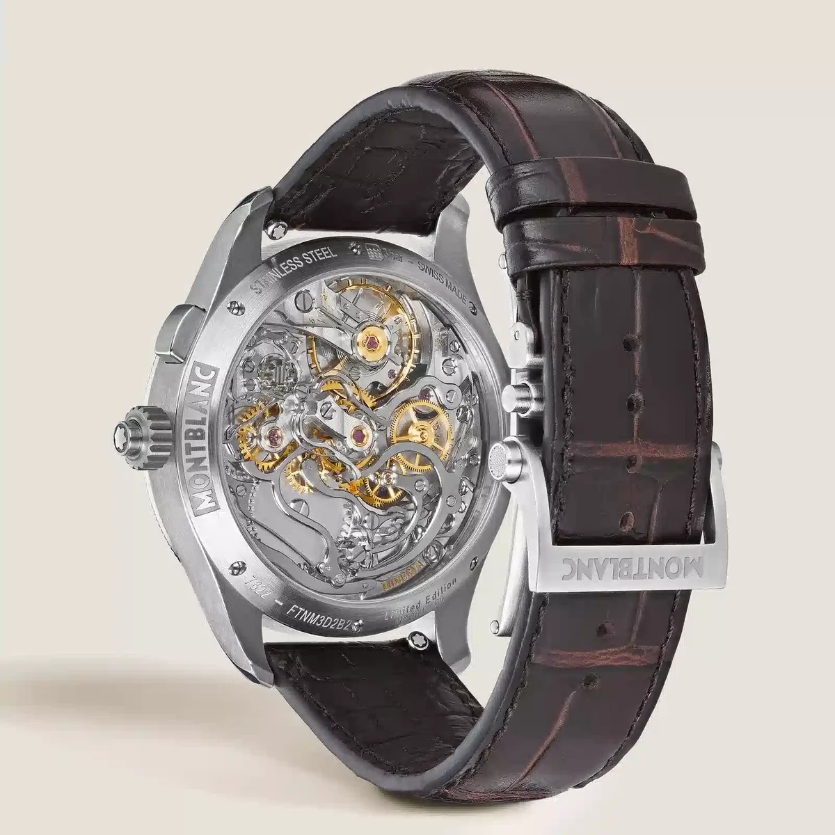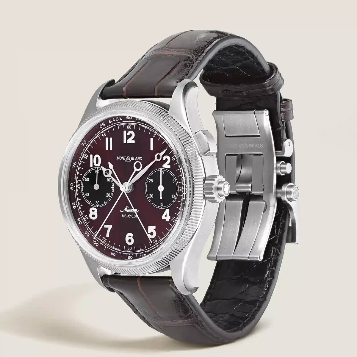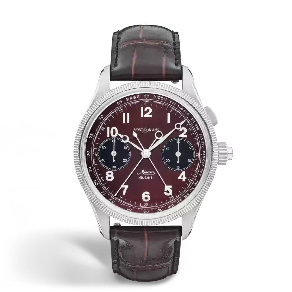 El Montblanc 1858 Split Second Chronograph Limited Edition se inspira en los primeros cronógrafos militares monopulsador de 42 mm de la década de 1930. Este nuevo modelo presenta una caja de acero inoxidable de 44 mm con un bisel fijo estriado de oro blanco 750/1000 (18 quilates). La esfera es de color burdeos oscuro con decoración rayos de sol, contadores de cronógrafo negros y números arábigos blancos luminiscentes que le confieren un aspecto elegante. Esta esfera, que ofrece legibilidad y un estilo vintage, se ve realzada por las agujas de las horas, los minutos y los segundos de forma vintage, una aguja central de split second y un contador de cronógrafo de 30 minutos. Al igual que en el reloj original, una escala taquimétrica (base 1000) rodea la esfera. El fondo de la caja revela el calibre MB M16.31, un cronógrafo monopulsador con doble segundero, acabado a mano y de cuerda manual, que permite al usuario medir tiempos intermedios sin interrumpir la medición continua de un tiempo transcurrido más largo. El reloj se completa con una correa intercambiable de piel de becerro en tono burdeos oscuro con estampado de cocodrilo y un cierre triple desplegable de acero inoxidable con sistema de ajuste fino.